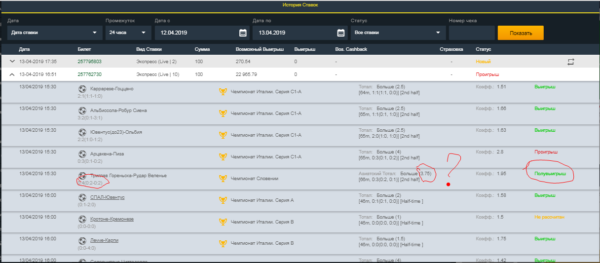 А как ты ставишь азиатский тотал, не глядя? Почитай, там ставка делится на две, одна может зайти, другая нет.