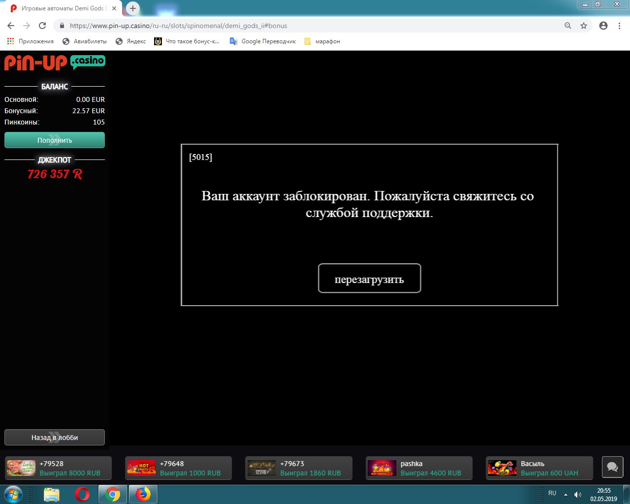 Все дело шло к мульонам , остался в том же слоте) выпала бонуска х800 = 200 евреев.после бонуса выпадает данная картина. Уже меня насторожило,что за б***во. перезагрузил слот, все нормально ничего не блокированно)))