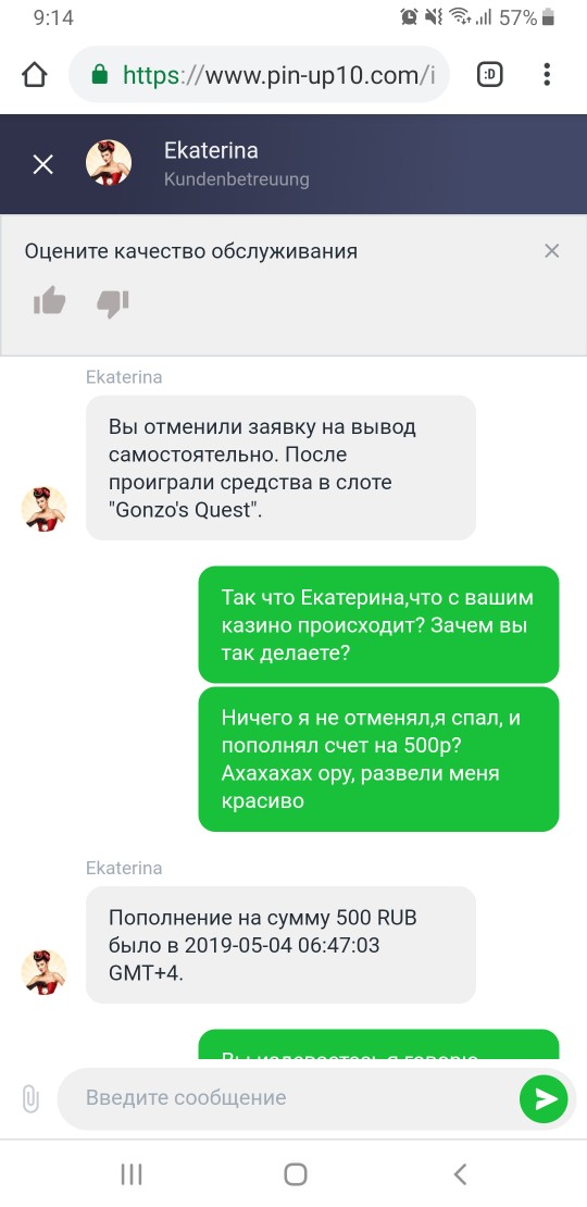 Ни в коем случае не делайте депозиты в эту помойку как Pin Up, стояло на выводе 13к с промокода,проснулся и кто то снял заявку на вывод и проебал все деньги,плюс депозит еще на 500р делал, и тут хуй че сделаеш.Типа кто то с Ураины,т.к был язык поменят на украинский.Айпишник с города Кировграда в истории захода на акк...))помойка ебаная))