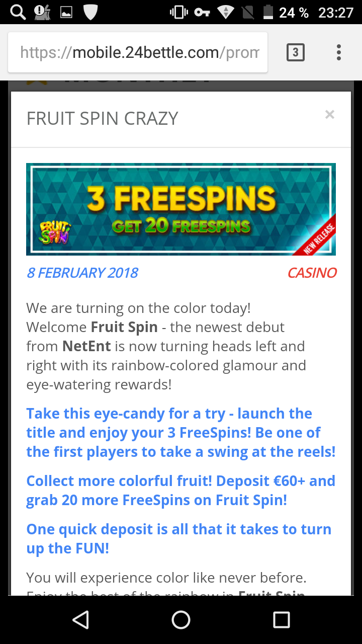 Депозит €25+ и получить 15 Фриспинов на фрукты спина