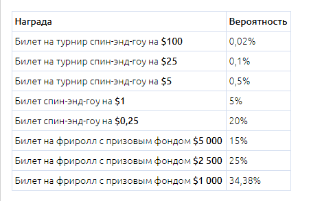 Вращая бонусное колесо, вы выигрываете билеты на турниры Spin&Go или фрироллы. Вероятности выигрыша различных призов акции в таблице:Кому что то нормальное выпадало ?