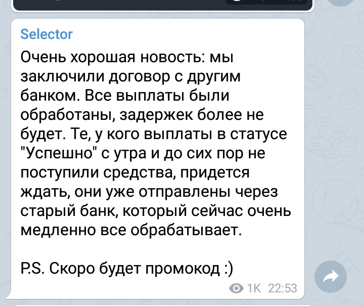 Да мутно как то ))) заглянул в телегу к ним, почитал их объяснение ситуации. Нет я конечно все понимаю и не такое бывает в великой необъятной... Но что за ? "мы заключили договор с другим банком" "старый банк просто медленно работает".... Не ужели нельзя как то поконкретней ? а то прям жалко банк стало ))) устал он ))) ручки ножки болят...