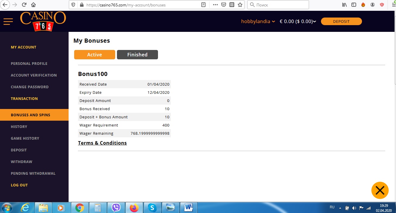 ладно - по евро сделал спинов до полной открутки вагера - специально посчитал спины - зашел в профиль - вижу вот что ( оставшийся ПРОЦЕНТ открутки вагера 768!!!)