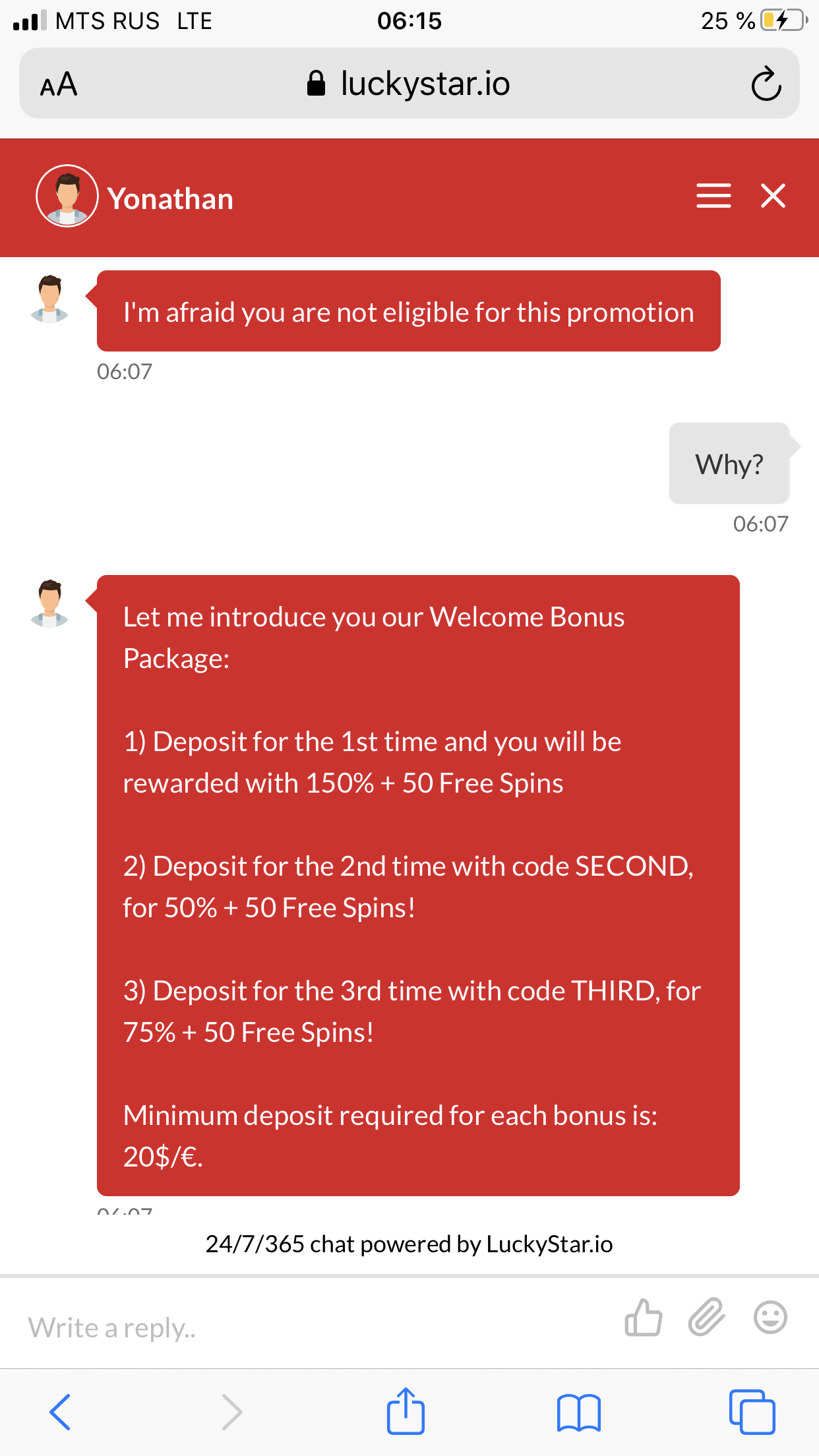 А я зарегался все пришло письмо на почту никаких проблем! В чат написал минут 5 молчание и в итоге мне говорят что я активировал бонус в декабре 2019 года))) я объясняю что только зарегистрировался , на что в поддержке парируют и говорят администрация имеет право отказать в бонусе на свое усмотрение! И просто закрыли чат! Интересное казино! Это я так понимаю они мне мульт типа приписали!