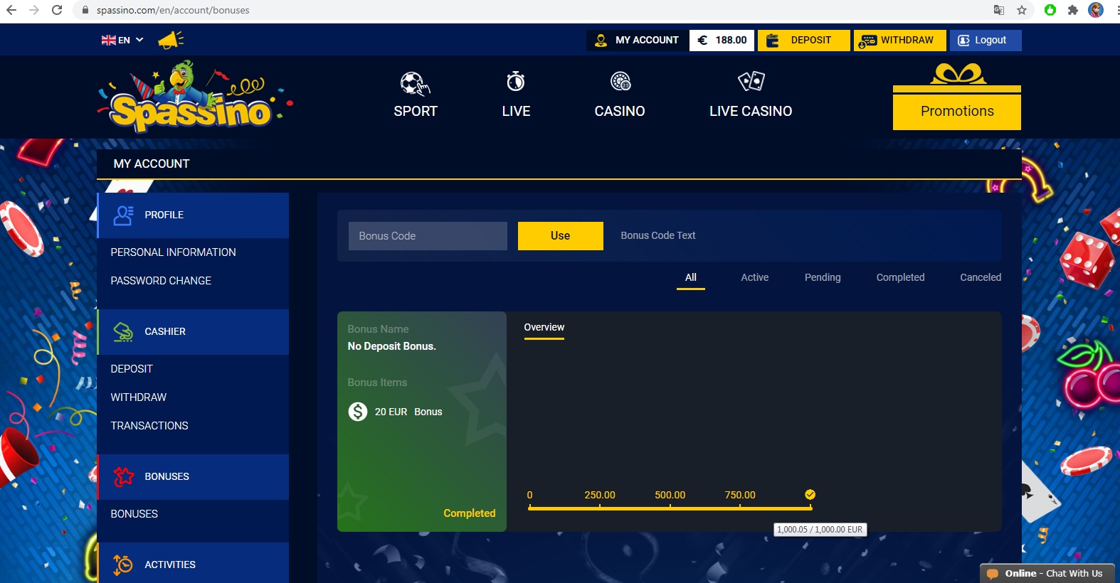 Для того, чтобы претендовать на 20 фунтов стерлингов Нет депозит бонус, вам нужно отправить по электронной почте с темой "No 20 Нет депозит бонус", чтобы [email protected] с вашим зарегистрированным адресом электронной почты на Spassino. https://m.spassino.com/en/account/bonuses