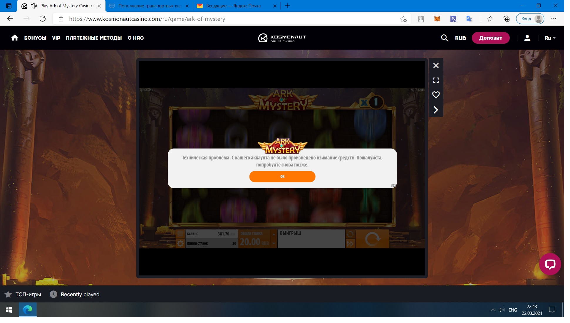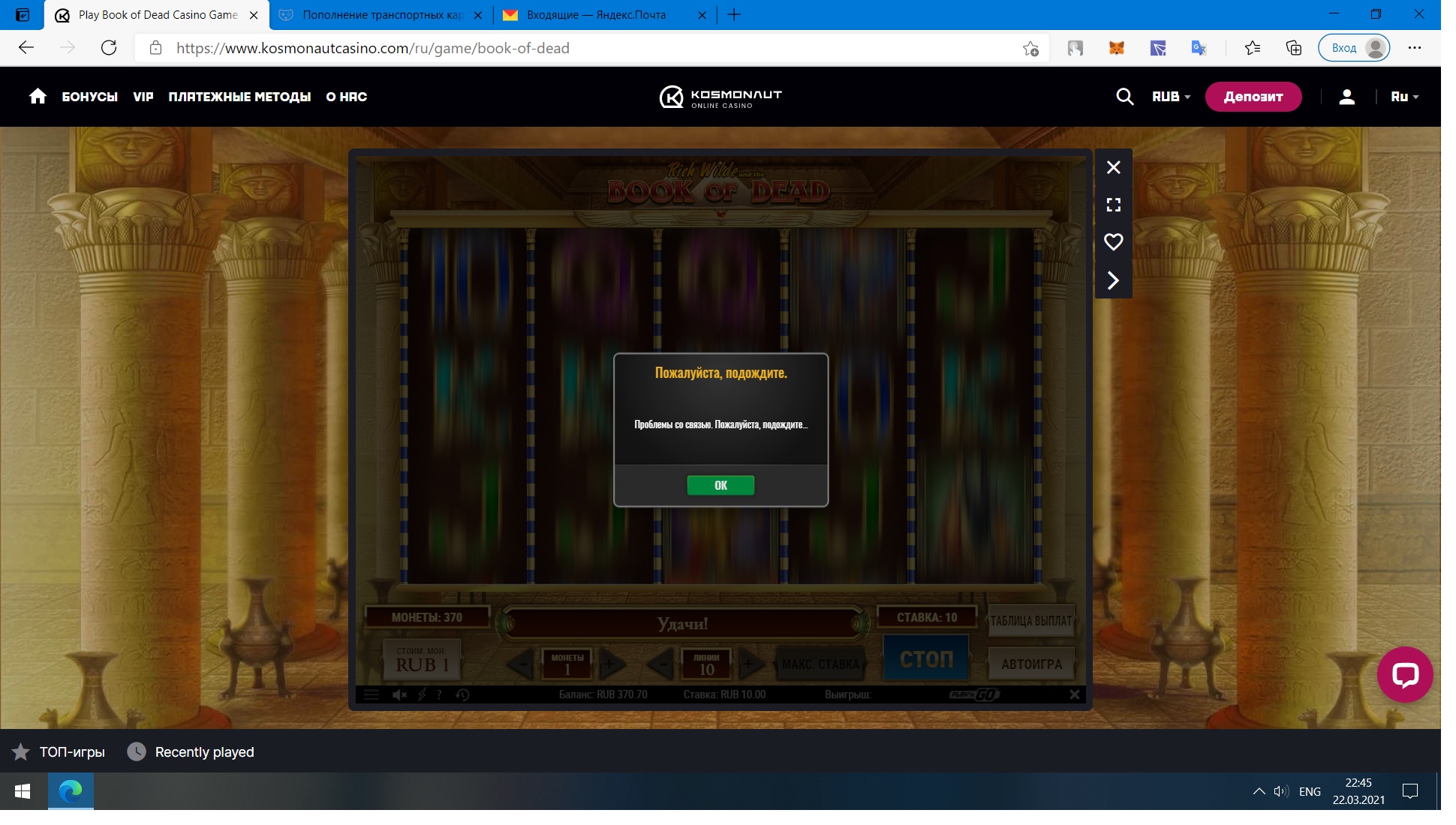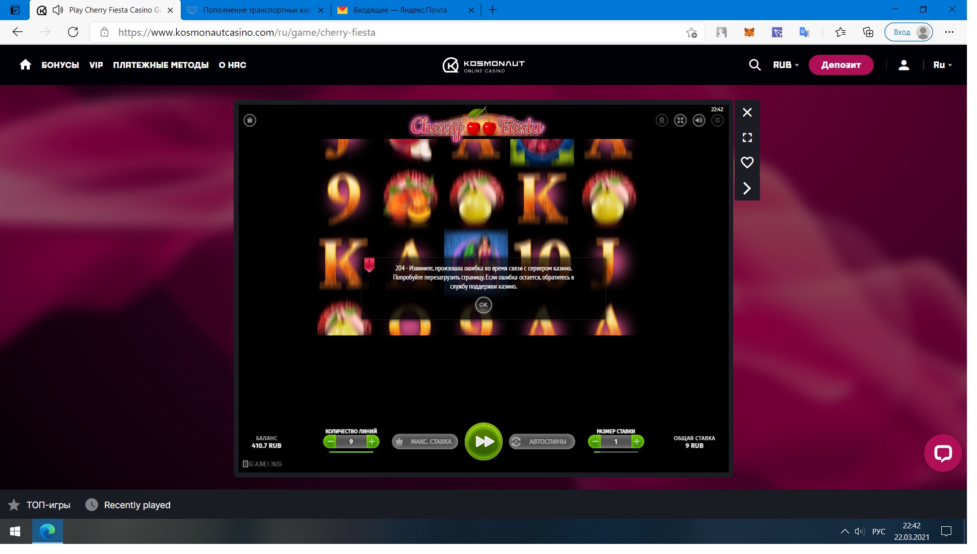 дальше ещё и тех проблемы испортили настроение, слоты или крутятся с большим подвисом, или ставка исчезает, потом табличка и снова ставка возвращается