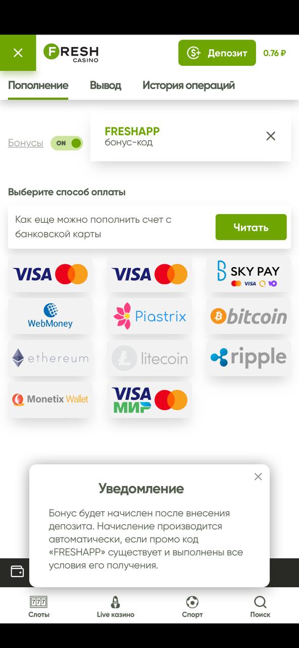 Средства, полученные с бездепозитных фриспинов, будут доступны для игры или вывода после внесения депозита и отыгрыша бонуса.