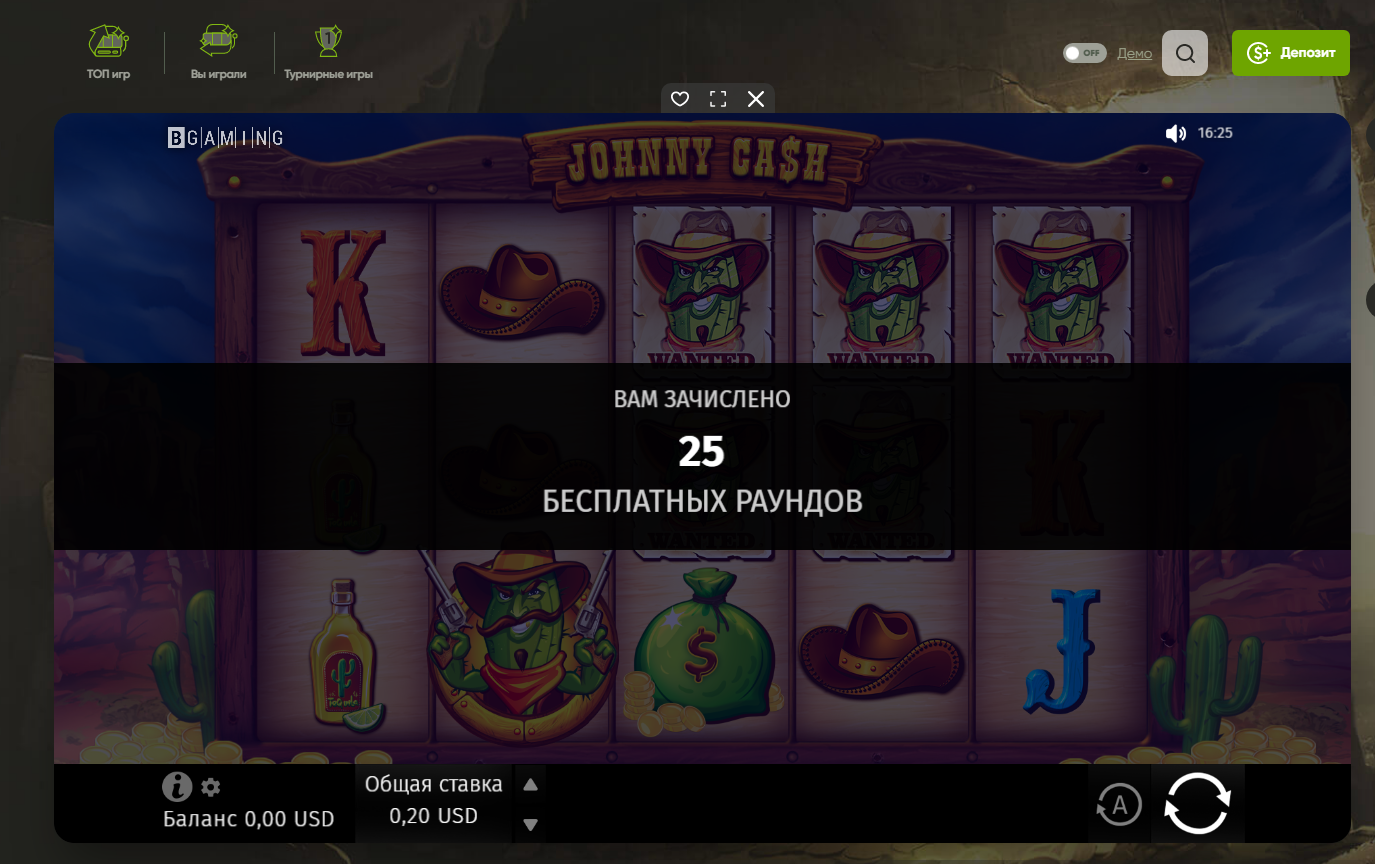 Фриспины доступны в ПК и мобильной версии Johnny Cash (Bgaming). Зачисление средств с фриспинов происходит мгновенно на бонусный баланс с вейджером 45.