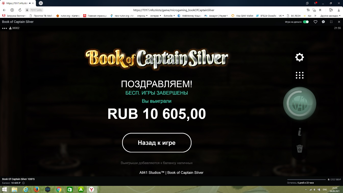100 фриспинов за депозит в 100руб. Слот Book of Captain Silver.