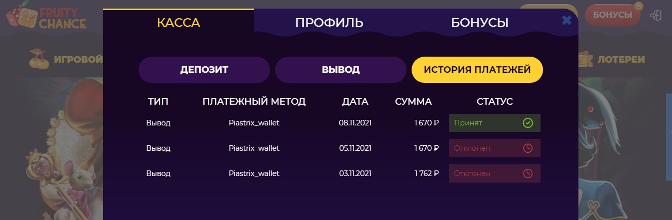 Точно такая же херня, уже второй раз на вериф отправили клоуны ахахахаха.Ребята, Фрути Шанс - это реально помойка. Короче мурыжили меня сперва с верификацией их гребаной. Еле как вроде бы прошел, потом сказали типа создай заявку заново. Ну ок, создал, потом отменили её под предлогом, что не все видно на скриншоте))). Во всех надежных казино все проходит. Ну это же бред, все там видно... Короче помойка просто очередная, модератор - добавить это.. в Черный СПИСОК, немедленно!