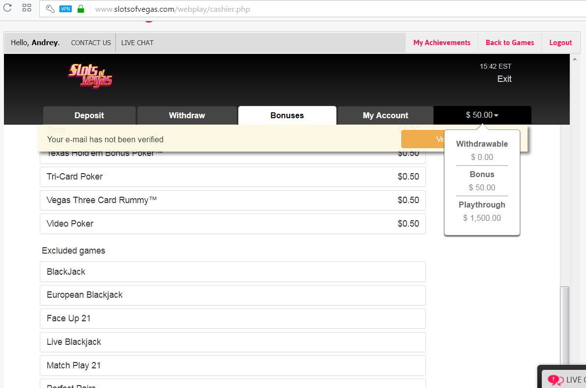 Пытаюсь отбить, но слоты не знакомые и хорошо что глянул условия. Там больше 1 бакса нельзя ставить в слотах при отмытии бонуса. Я там вроде вчера пытался отмыть за регу, а сегодня на почту пришло что ещё 50 баксов дали с вагером х-30. Кто хочет пробуйте, там за регу должны плюхи давать, вчера давали https://www.slotsofvegas.com