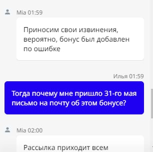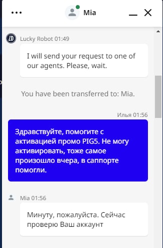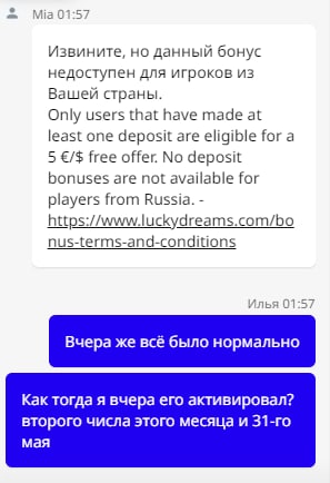 ну бред какой-то. 2-3 дня подряд активировать промокод мне помогли в саппорте предоставив им скрины промо рассылки, а сегодня сказали что все эти активации данного промо были ошибочными. Будьте осторожными с бездепозитными бонусами на LuckyDreams иначе, предполагаю, могут отменить выплату с бездепа с такой же отмазкой по типу "Данный бонус был добавлен по ошибке" как бывало у некоторых в других казяках