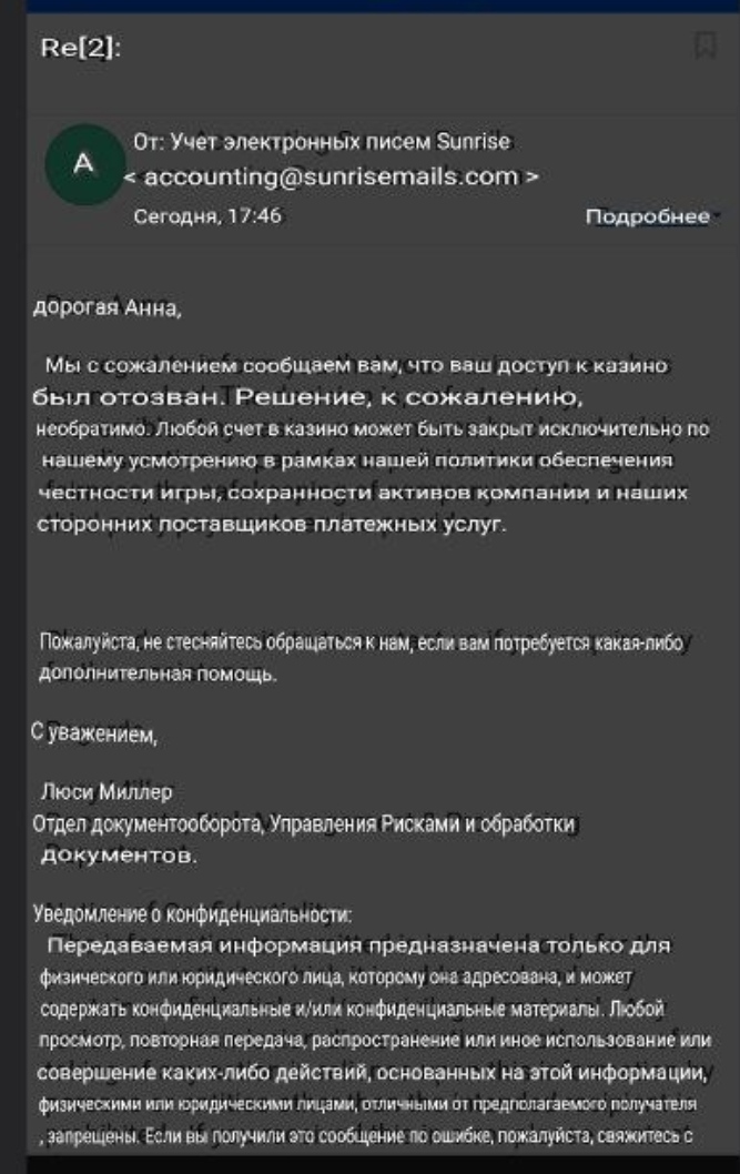 Вот письмо от казиноКто-нибудь выводил с этой шараги? sunriseslots.КОМ