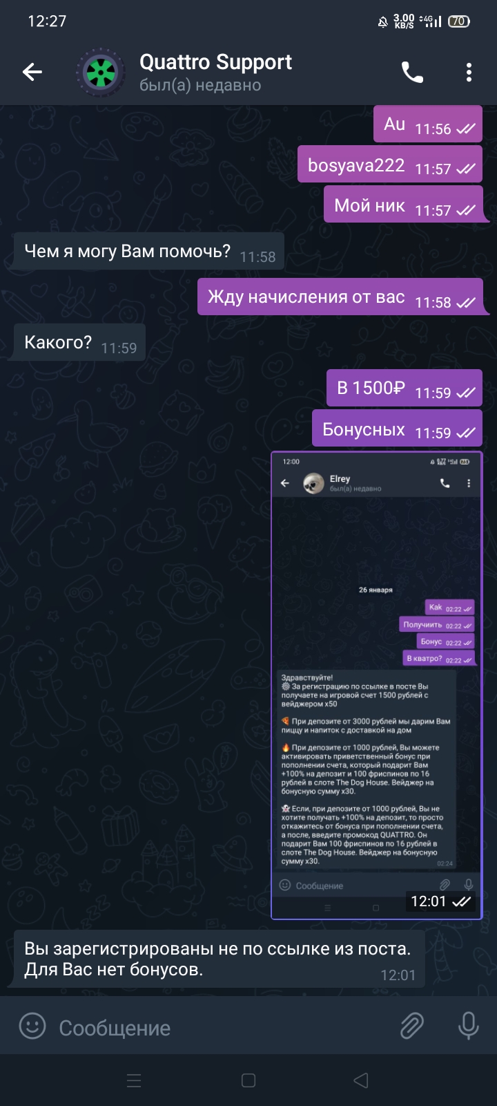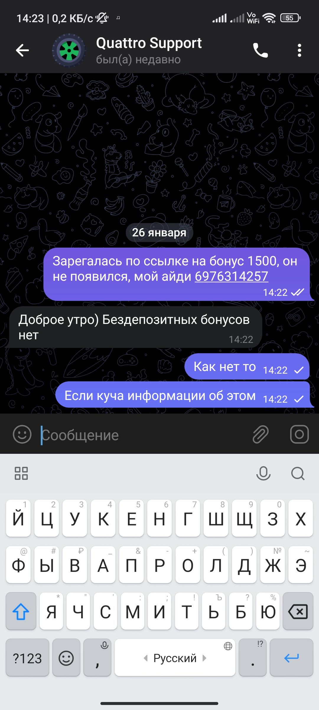 говорят у них нет не каких бездепозитных бонусов)Находим казино quattro точка bet , находим у них на сайте телеграмм канал, через его регистрируемся и получаем бездеп 1500₽. Остальную информацию я не знаю