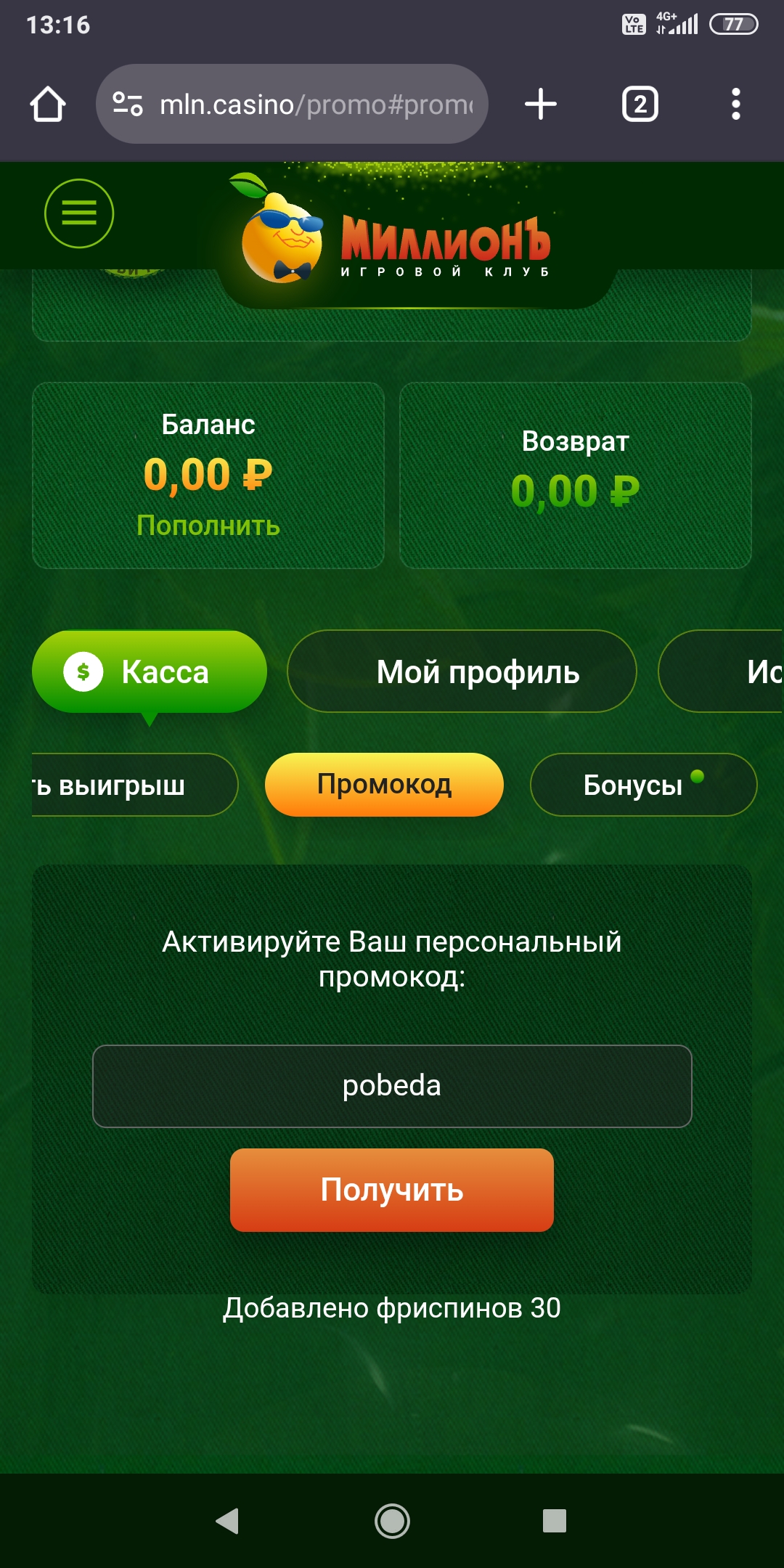 Казино Милионъ код pobeda даëт 30 фс по 18 , мне сыпануло бонус насыпало с них 4к, долго мыть буду🤦‍♀️🤦‍♀️🤦‍♀️