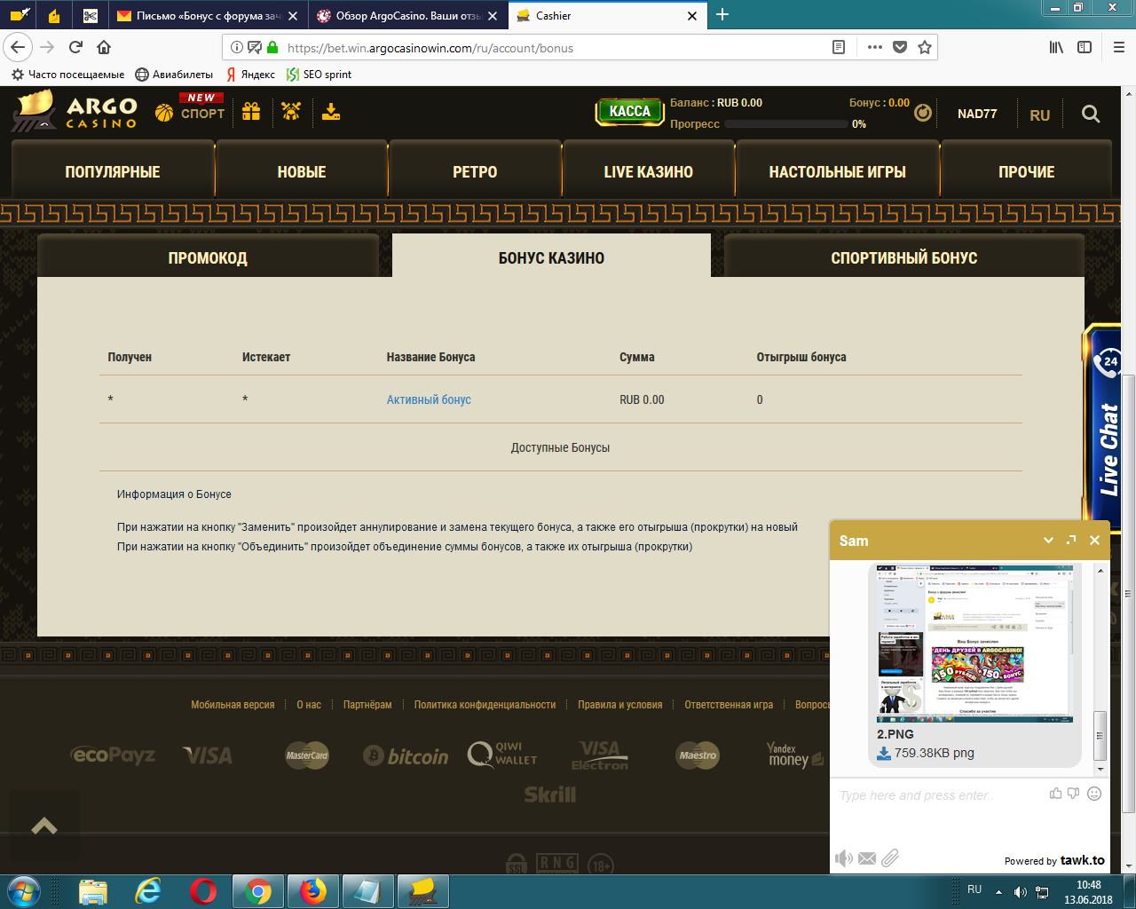 На почту пришло,что бонус зачислен, а в аккаунте нет.Пошел в лайф чат2.PNG