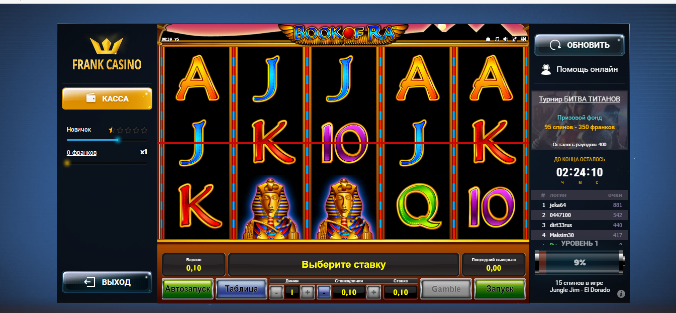 В университете Casino Frank началась сессия... Чтобы успешно сдать экзамен, необходимо знать все игры Novomatic! Думаем, проблем у вас не возникнет, ведь вы так любите читать книжки и крутить 10 БЕСПЛАТНЫХ СПИНОВ в игровом автомате Book of Ra! Обращаем Ваше внимание, что игры Novomatic доступны только для пользователей с айпи адресами РФ и Республики Беларусь.