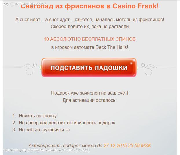 А вы охеренное казино,позавчера давали 10 спинов в подарок на Deck the hall,во время действия подарка слот не грузился,а как только время подарка истекло,слот чудесным образом заработал)))),красавцы.С рождеством вас и клиентов с синдромом "дауна"вам побольше.