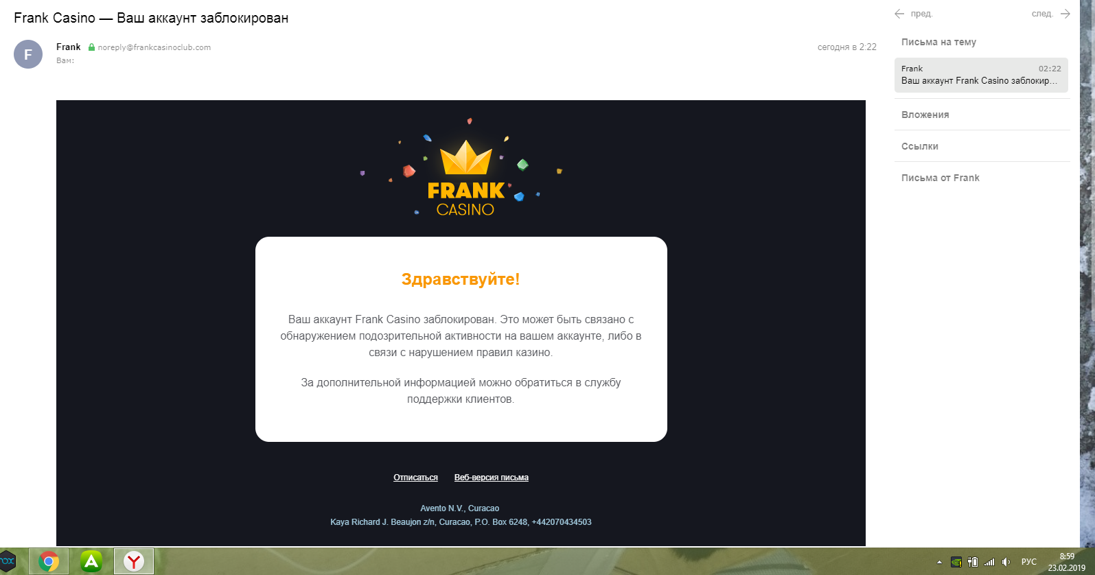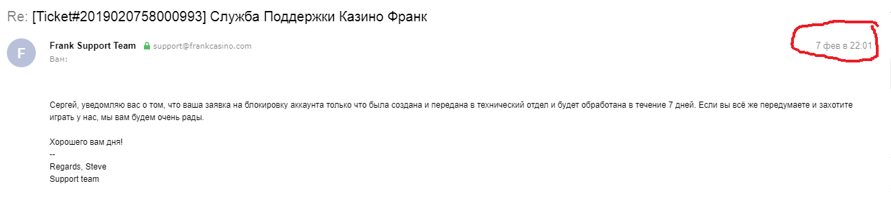 Дабы избежать подобного рода ситуаций - у игрока в распоряжении есть 7 дней, в течении которых ему достаточно воздержатся от депозитной/игровой активности и аккаунт будет успешно заблокирован. В противном случае - заявка отменяется, т.к. сам игрок возжелал продолжить играть в казино Франк.