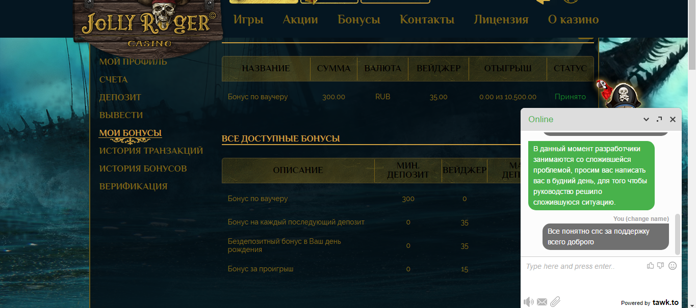 Уважаемый представитель данного казино, вчера я получил личный бонусный ваучер на триста рублей. Во время отыгрывания бонуса система дала сбой и статистика бонуса перестал отчёт отыгрыша. Из за этого неудобства я проиграл бонус, хотя мог вывести, но система не давал сделать этого. Бонус до сих пор висит у меня в кабинете.