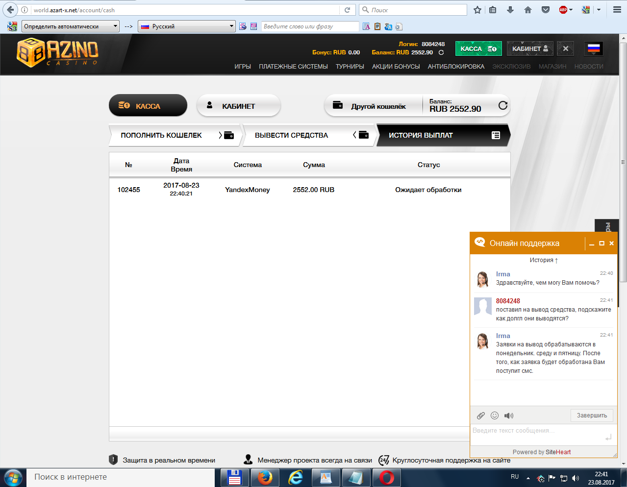 Спасибо Вам за развернутый отзыв.как оказалось я раньше ошибался на счет данного казино.хочу описать.бонус данный мне в теме - https://casino.my/threads/konkurs-skrinshotov-ot-azino888-na-30000-rublej.4775/ .Я отыграл за 1-2 дня,точно не помню, так сказать застирался - автоматы не реально сыпали,что даже в начале забыл про конкурс, когда вспомнил,посмотрел условия его, сделал депозит и играл дальше уже вылаживая скриншоты,жаль что с самого начала это не делалoohdoor:.За эти часы что я провел в данном казино получил огромное так сказать удовольствие,что даже перестал смотреть баланс, а когда присмотрелся, то с 200 рублей бонуса,что дал официальный представитель - у меня на балансе было более 10. 000 рублей.Тут я уже и разошелся начал ставить по 20-100 рублей на слоты, но тут не очень по таким ставкам слил до 1000.тут думаю ну опять, как отбитие бонуса подходит к концу - все в ноль уходит.перешел на ставки 5-8 рублей и начилось - опять начало сыпать бонуски и.т.д.заигрался так что проспал работу. остановился как на балансе осталось 2500 рублей, хотя бонус уже был отбит еще 1-2 часа назад, увлекся.