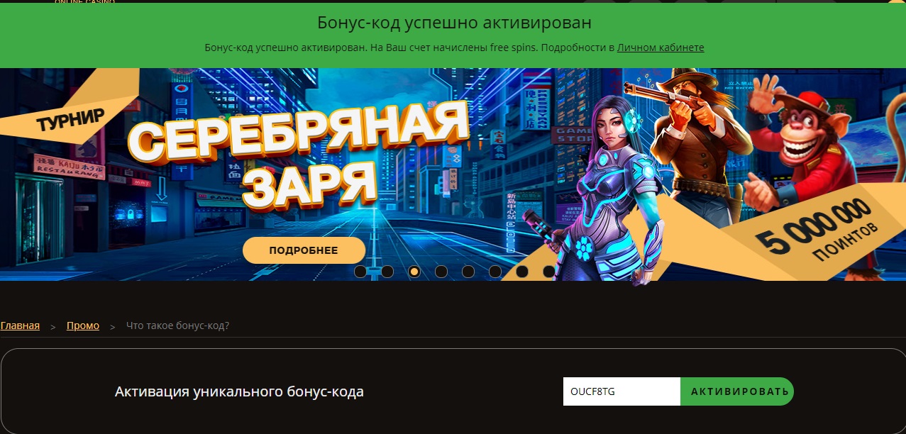 В меню ПРОМО >> Активация бонус кода: OUCF8TG