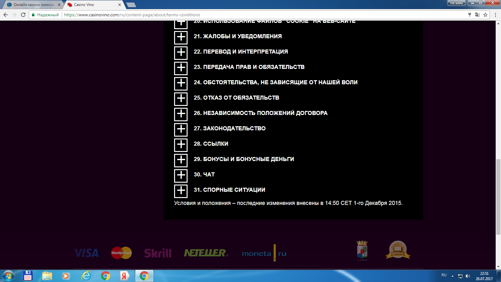 Хотим прокомментировать заявление ZadiakBrn о сделанных общих ставках на сумму 20000руб. и о том, что ему не хотят вывести деньги с депозита: Данный игрок , зарегистрированный на сайте casinovino, как ([email protected]), действительно играл на бонусную 1000 руб., но сумма его общих ставок на данный момент составила 12612,5руб., что пока не соответствует условию для вывода средств.