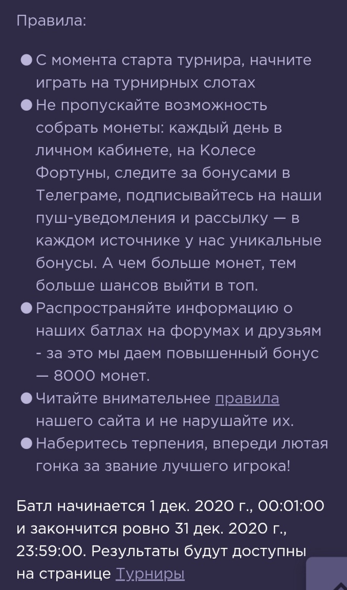 1. На протяжении всего декабря батлиться в прогрессивном турнире. Напоминаем, что он проходит ⏰ каждую среду с 15:00 до 15:20 по МСК.