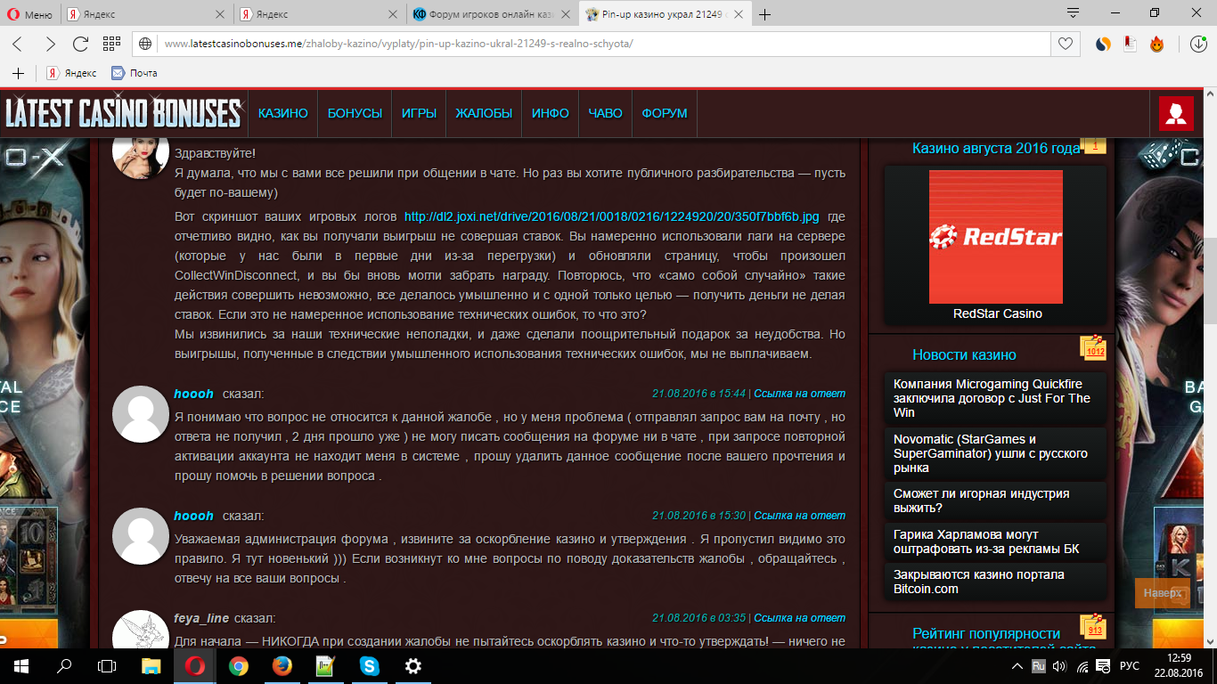 Касательно вышеупомянутой жалобы с другого ресурса: мы ему там ответили, предоставив исчерпывающую информацию о его не совсем честном выигрыше. Там было чистой воды умышленное использование технических ошибок во время лагов на сервере, и игрок, используя этот фактор, умышленно обновлял страницу с целью получения выигрыша БЕЗ совершения ставки. Скриншот его логов имеется http://dl2.joxi.net/drive/2016/08/21/0018/0216/1224920/20/350f7bbf6b.jpg