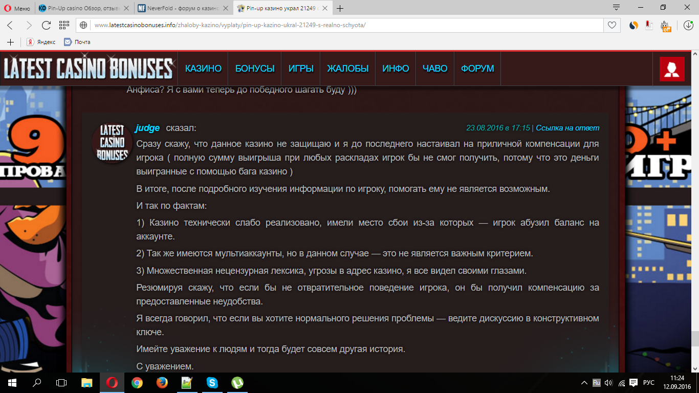 оу оу полегче ))) Моя цель не возврат денег, а опускание казино пиНАНАп ))) А лэйтес меня не послали, это во-первых ))) Я вам переписку с админом показывать не собираюсь))) . Во-вторых запомни Ольга , тех. ошибки казино - это проблема казино и входить в их положение я не намерен. В третьих, матом крыл их не я . Как бы странно это не звучало это был не я .( Если на лэйтасе тему пинапа откроете , то там всё написано). В четвёртых , я ничего не хочу от других ресурсов , я давно попрощался с выигранным баблом . Я не прошу от вас помощи решении вопроса!