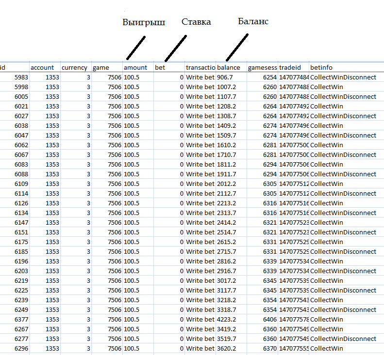 Из лога видно, что ни одной ставки не было сделано. Его баланс увеличивался при каждой попытке сбора выигрыша, из-за того, что он умышленно рефрешил страницу вызывая дисконект (collectwindissconnetc). Этот абуз с рефрешем он крутил несколько часов, набив 25377.7 бонусных рублей. После чего он пошел отыгрывать бонус в других слотах, т.к. при отсутствии ставки отыгрыш не происходил.