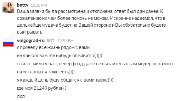 После этого пошли оскорбления, угрозы, шантаж, в надежде на то, что заведение пойдет на уступки. Игрок выпрашивал сначала полную сумму, потом 5 т.р., но так и не понял, что его попытки шантажа при любом раскладе будут безуспешны.