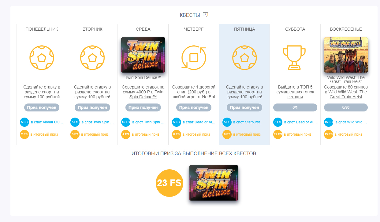 Мы рады сообщить, что на сайте запущены квесты, суть которых заключается в том, что на неделею формируются задания, которые можно выполнить и получить фриспины в качестве приза. А также, если выполнить все 7 квестов, сможешь получить итоговый приз!