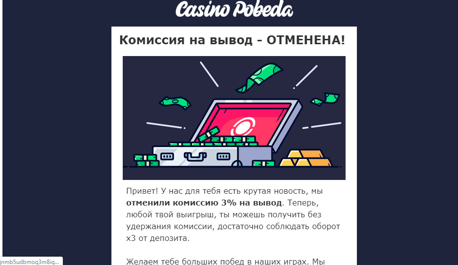 Привет, Друзья! У нас для Вас есть крутая новость, мы отменили комиссию 3% на вывод. Теперь, любой Ваш выигрыш, Вы можете получить без удержания комиссии, достаточно соблюдать оборот х3 от депозита.