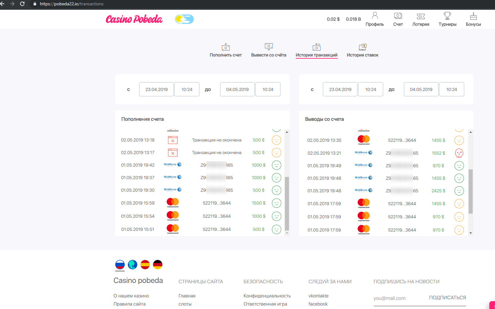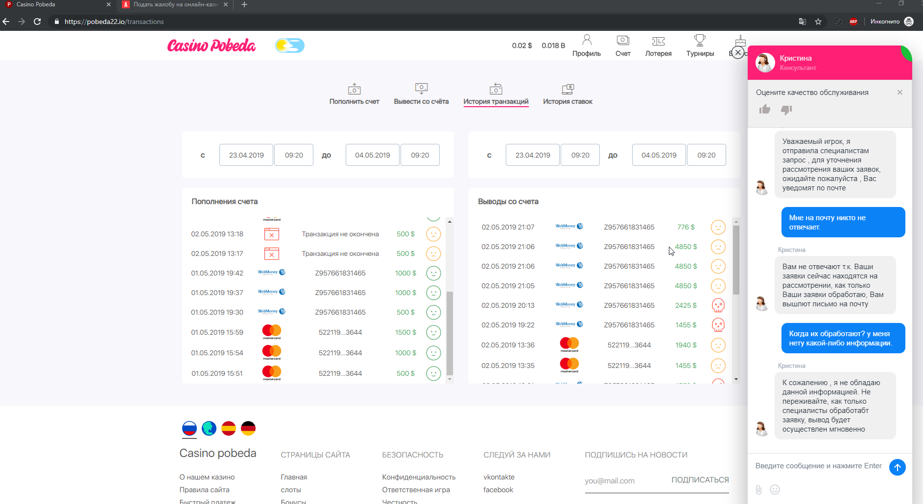 Я с такими казино поступаю так: иду до победного, не сливаю выигрыш, а когда выводят, я про них просто забываю и больше не ногой туда и всех знакомых и друзей отговариваю туда заходить. Такие казино надо любыми возможностями как то наказывать, даже если им это вредит по мелочи.Что у Вас там происходит????? Помогите, пжл, вывести 2000 рублей!!!! С утра висят в истории транзакций, но по выводу одни отговорки!!!! Вы же сами свой имидж подрываете!!!!