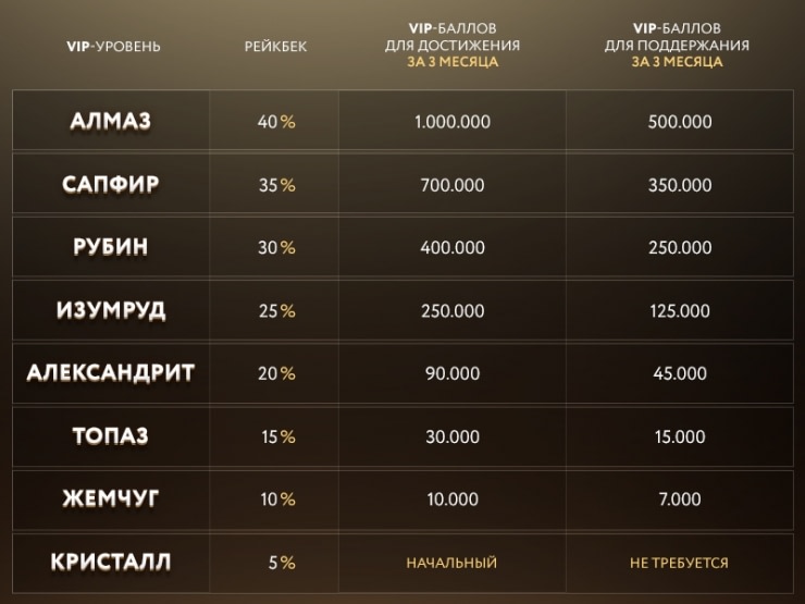 Обе комнаты предоставляют до 40% рейкбека. VIP-программа у них одна. Существует 8 уровней. Чтобы набить максимальный «Алмаз» нужно набрать 1 млн баллов за 3 месяца (~ $1,500 рейка в месяц), а для его поддержания достаточно наигрывать в 2 раза меньше баллов. Этот уровень дает 40% рейкбека.