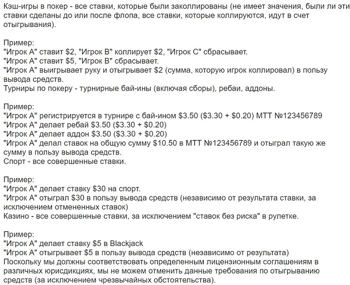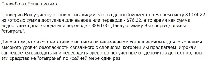 В письме служба поддержки приводит пример условий отыгрыша вашего депозита для последующего перевода