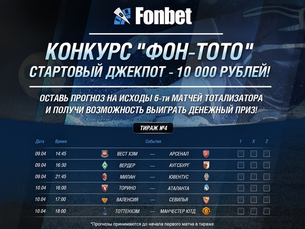БК Fonbet в тираже№4 "Фон-Тото" на своей официальной странице ВКонтакте проводит с 30марта по 9 апреля 2016 г. конкурс прогноза из шести футбольных команд, джекпот конкурса (призовой фонд): 10 000 рублей.