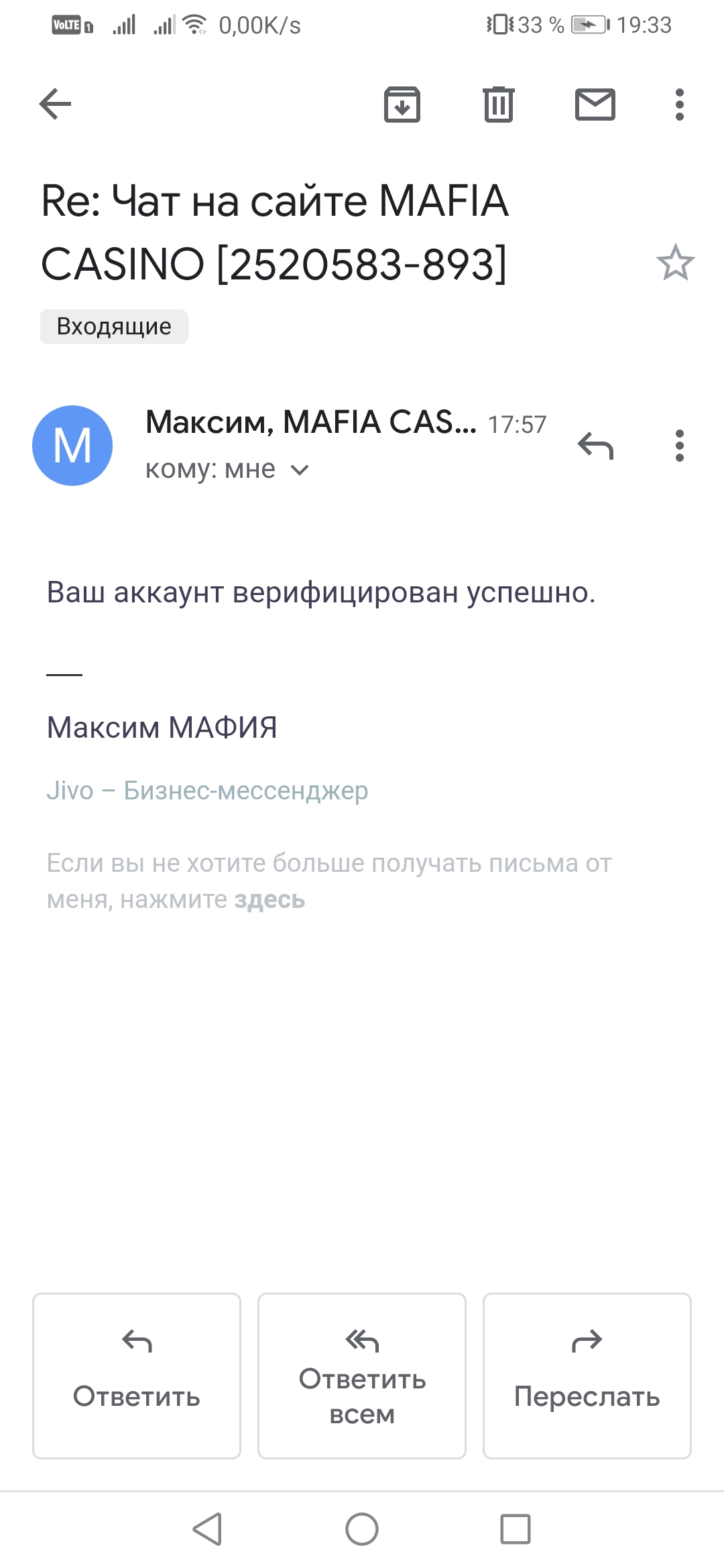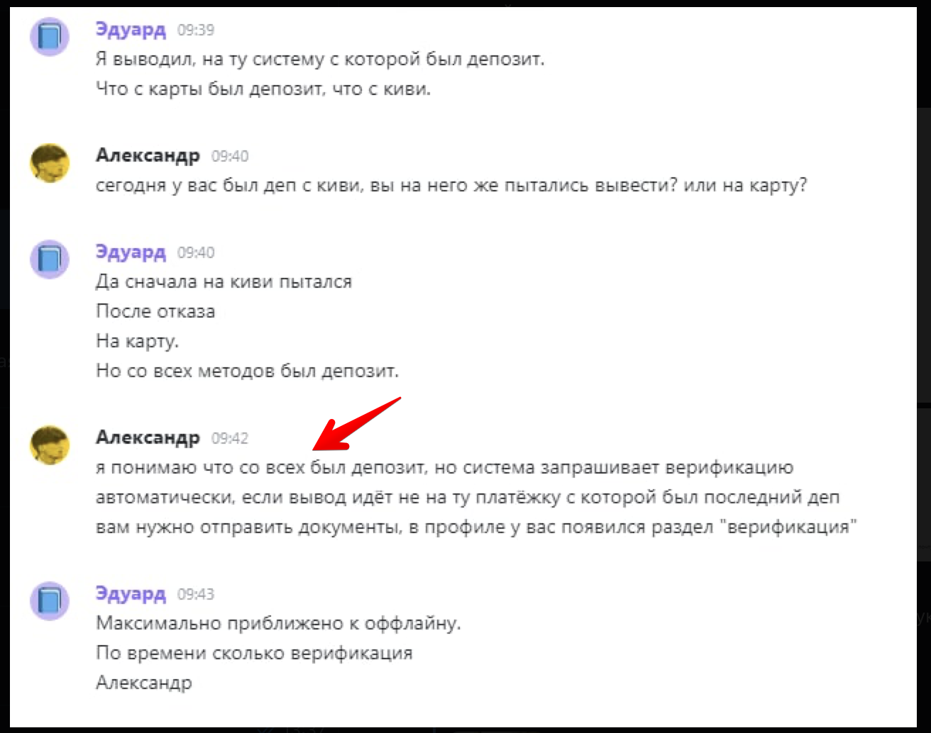 Не забывайте сказать, то что я попытался вывести деньги на ту же карту. На ту же, какое тут отмывание средств? Верификация пройдена была через пять часов после обращения.