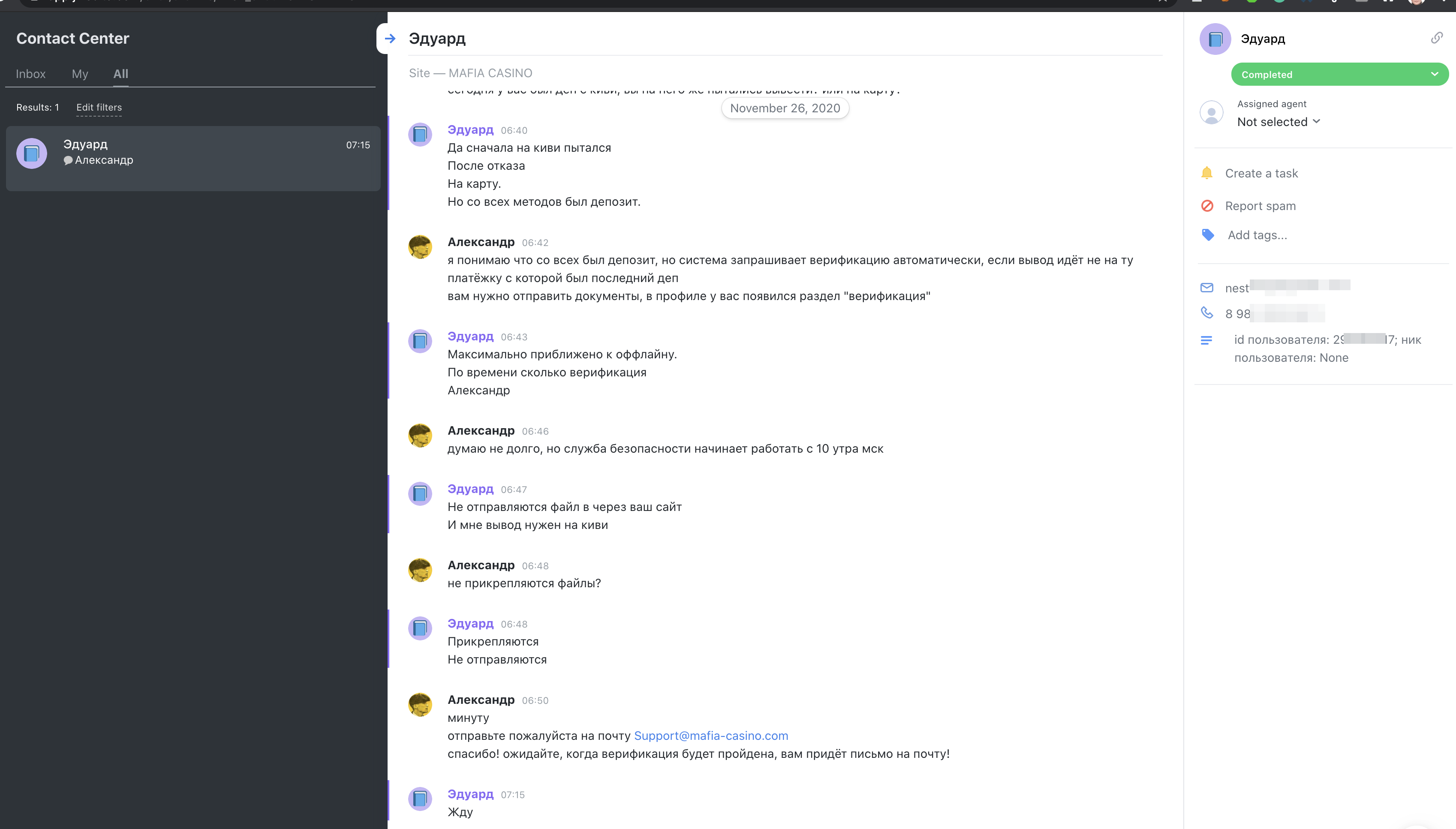 Не забывайте сказать, то что я попытался вывести деньги на ту же карту. На ту же, какое тут отмывание средств? Верификация пройдена была через пять часов после обращения.
