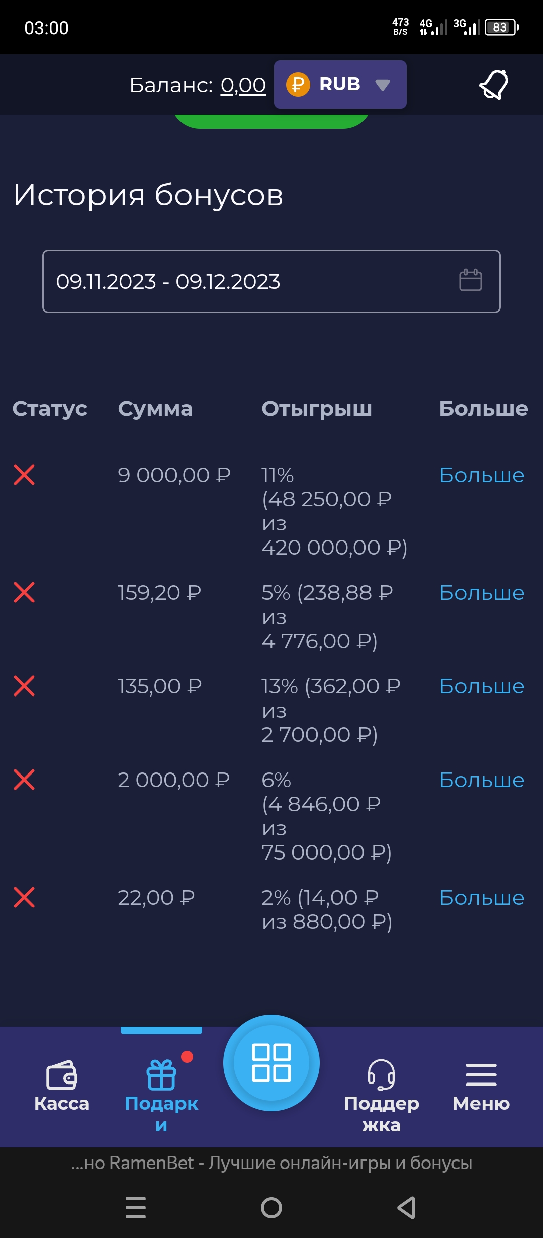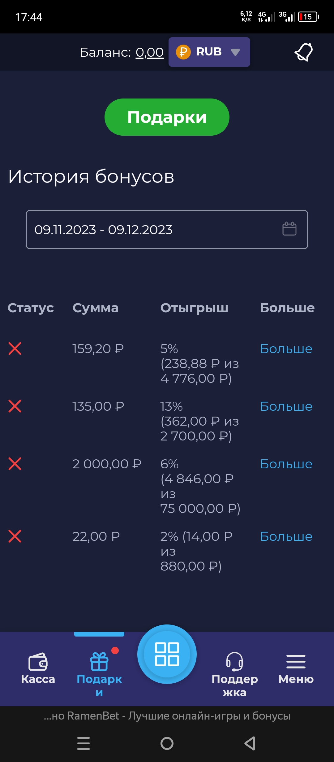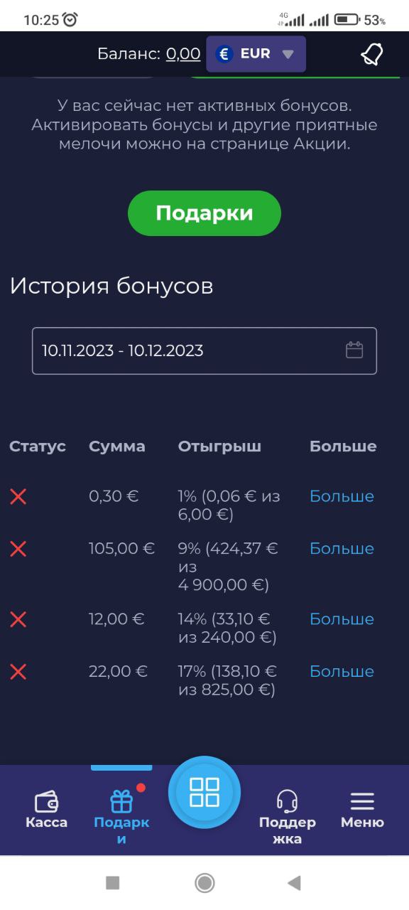 Не повезло, не фортануло. Одну бонуску увидел на икс15 с ретригерами в Olympus gates за 20 спинов столько дало. Но это норм, у меня в прагматике и о часто бывал. Депал 1к, сверху 2к бонуса дали, 50 спинов с первой партии (ещё 200 обещали, разбиты по 50 спинов на день), потом какой-то бон появился по 5р в манитрейн3 (саму бонуску дали по 5р) и в лк не понял, какие-то ещё 22р показаны, это что было не понял. По дизайну бонс казино напомнило.