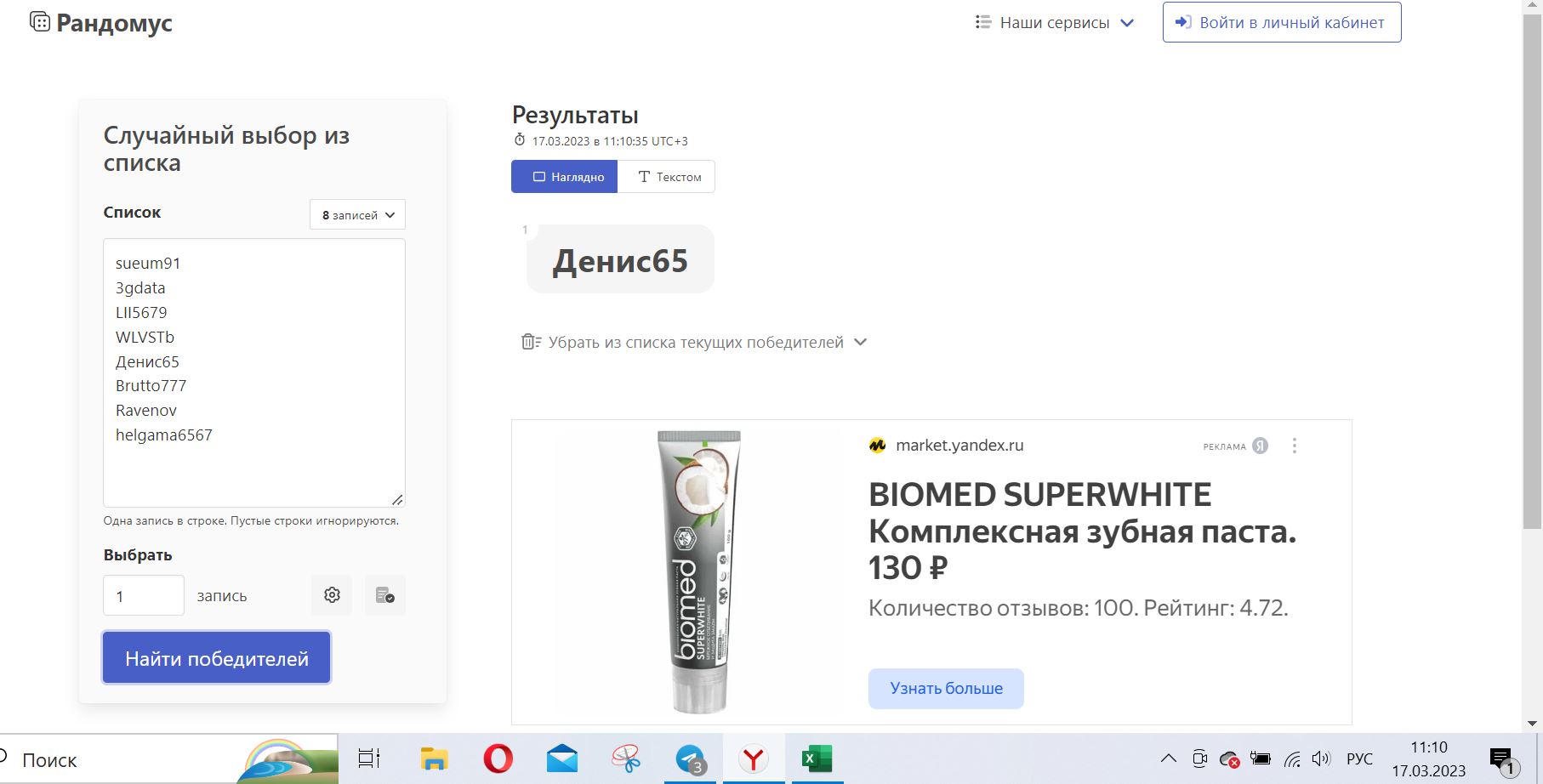 VelesG Администратор Команда форума Администратор 13 Май 2017 35,234 119 t.me Credits ¢226,330 17 Мар 2023 #47 Желающих поучаствовать видимо уже не будет, поэтому рандом проведем сейчас... Список участников: sueum91 3gdata LII5679 WLVSTb Денис65 Brutto777 Ravenov helgama6567 Сейчас рандомом выберем победителя, итоги в следующем посте...