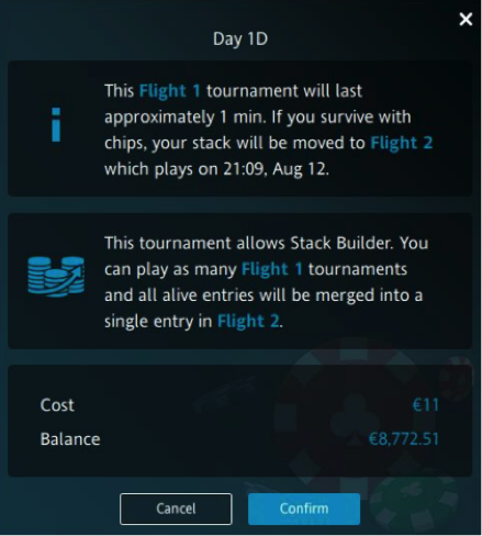 ▪ Если для турнира Flight предусмотрены события «День 1» с мульти-входом и функцией Stack Builder, игроки могут участвовать несколько раз в турнирах «День 1» и пройти в турнир «День 2» с суммой фишек со всех квалификаций турниров «День 1».