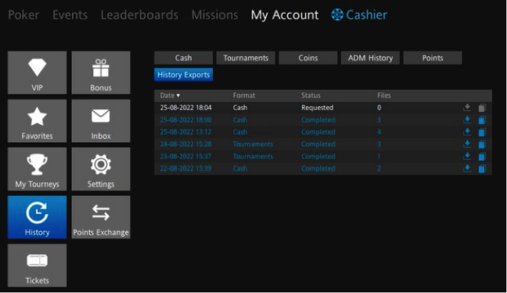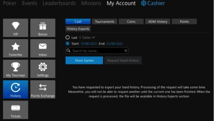 Функция позволяет игрокам загружать и/или делиться своей историей раздач. Вы можете запросить экспорт истории раздач в формате XML для кэш-игр или турниров. Для этого необходимо перейти на страницу «Мой аккаунт» > раздел «История» и выбрать либо вкладку «Кэш», либо вкладку «Турниры». Далее укажите период для экспорта истории рук и нажмите на кнопку «Запросить историю рук».