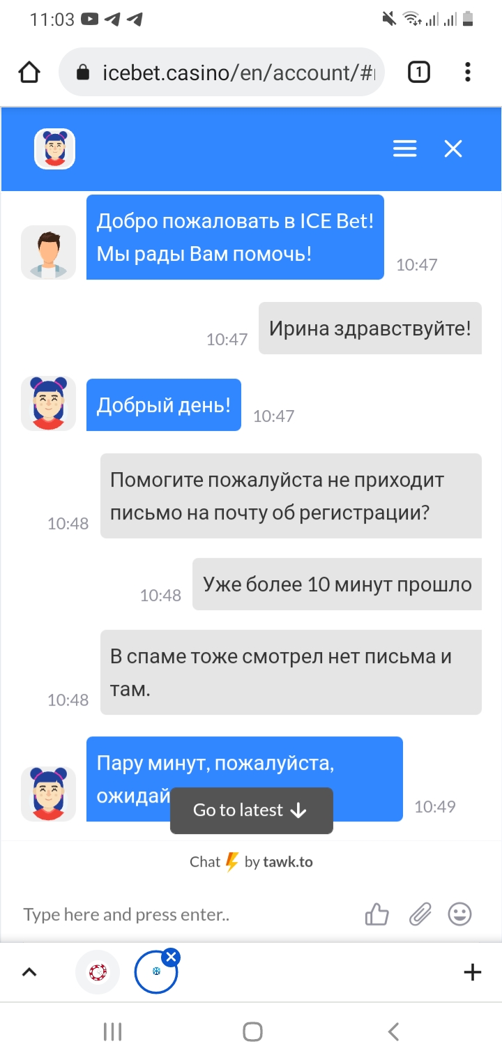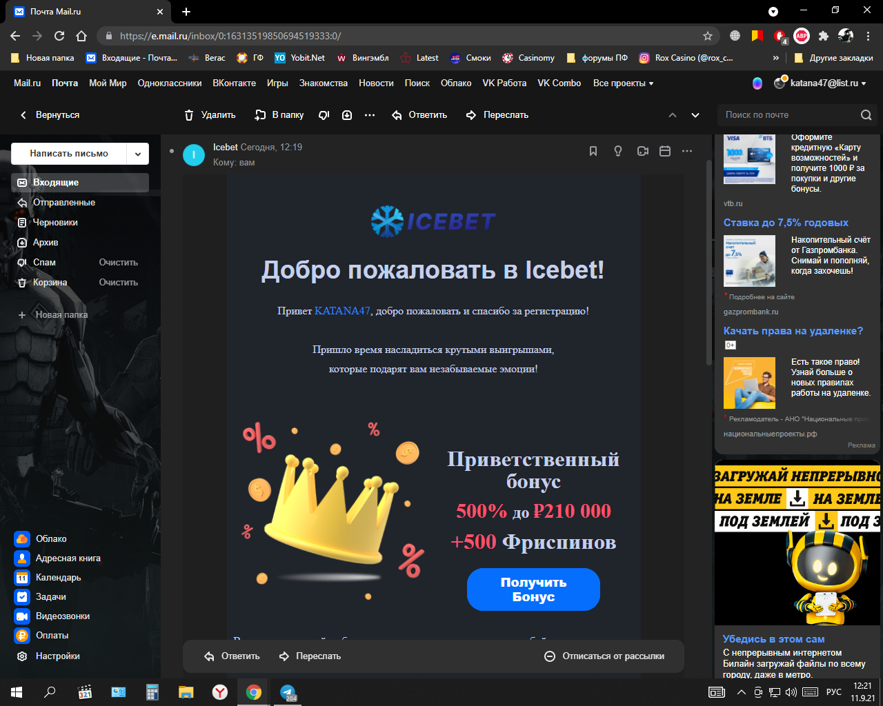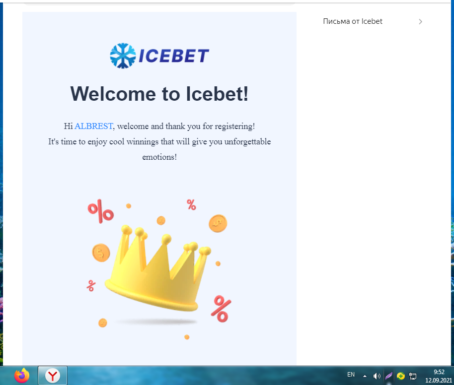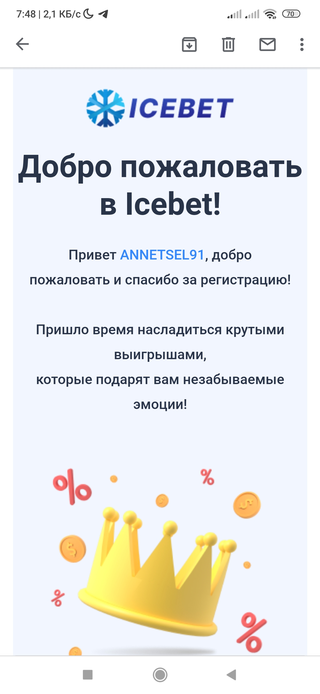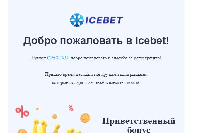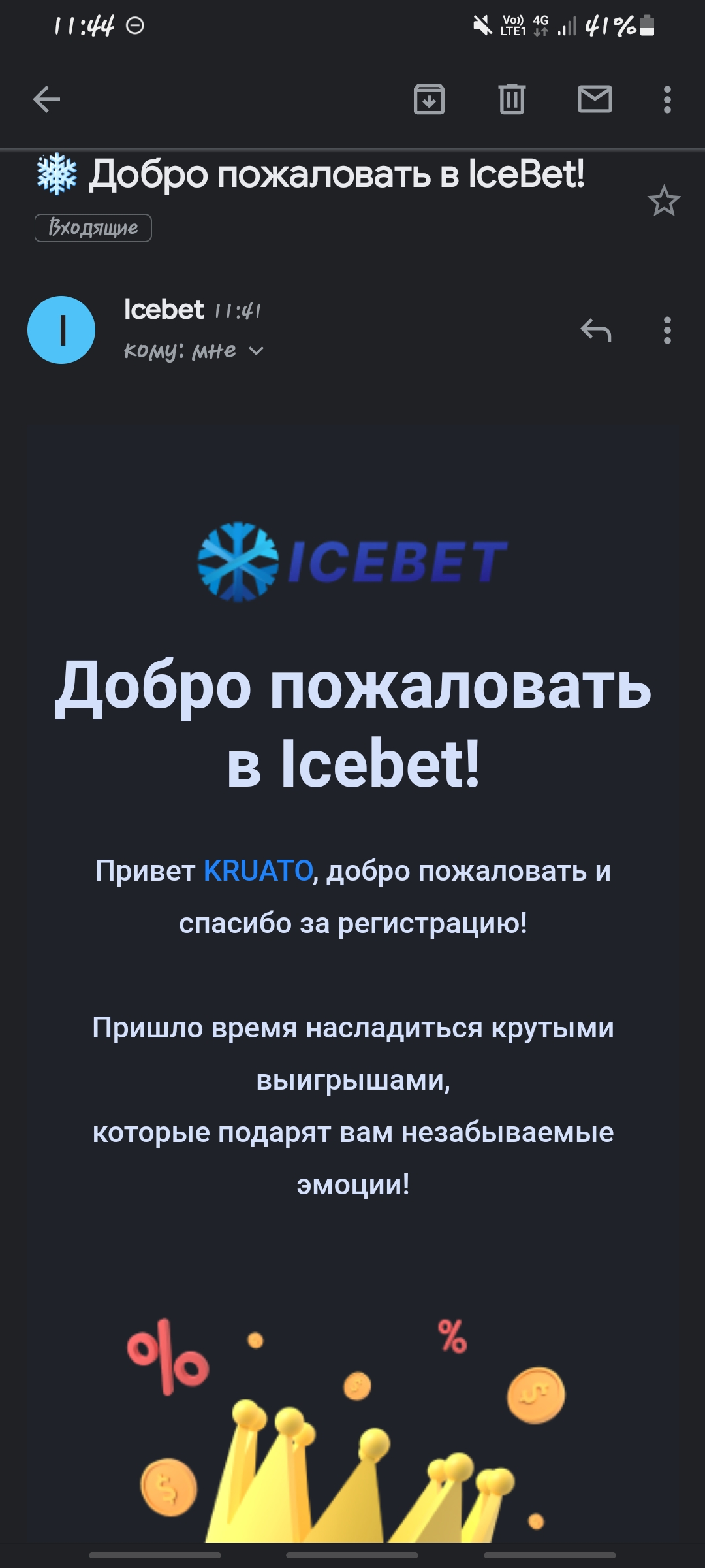 Письмо с регистрацией не могу найти, зарегался еще когда только выложили это казино до бонуса в 500%, было 290% неактуальное вроде бы.