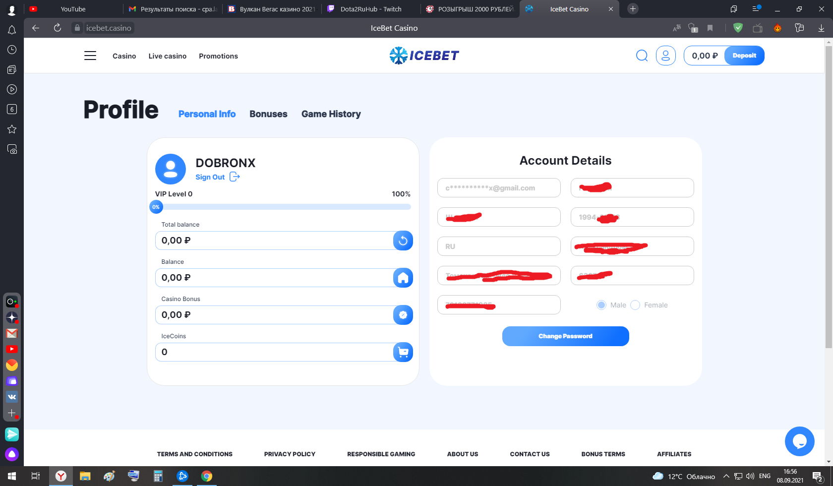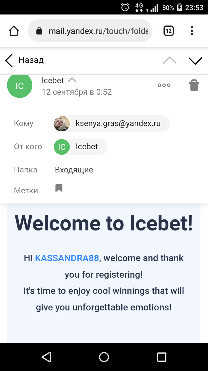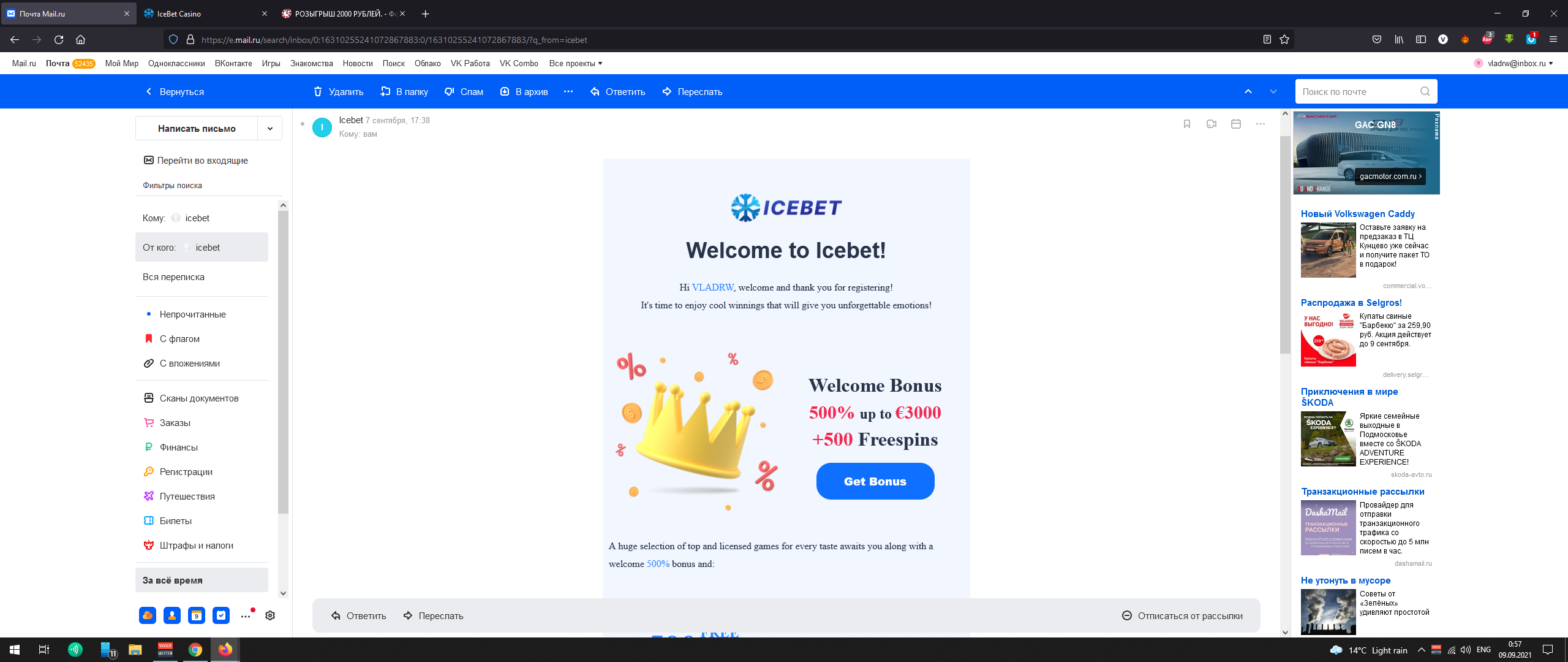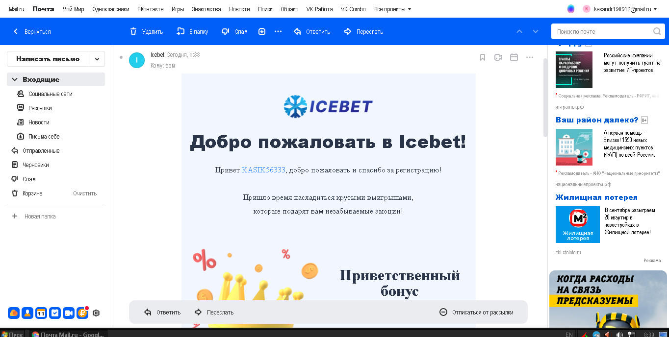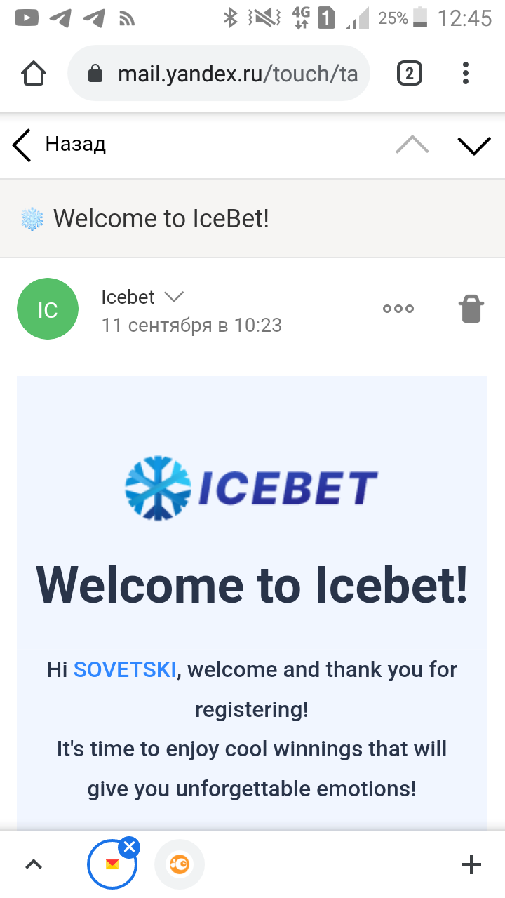 Письмо с регистрацией не могу найти, зарегался еще когда только выложили это казино до бонуса в 500%, было 290% неактуальное вроде бы.