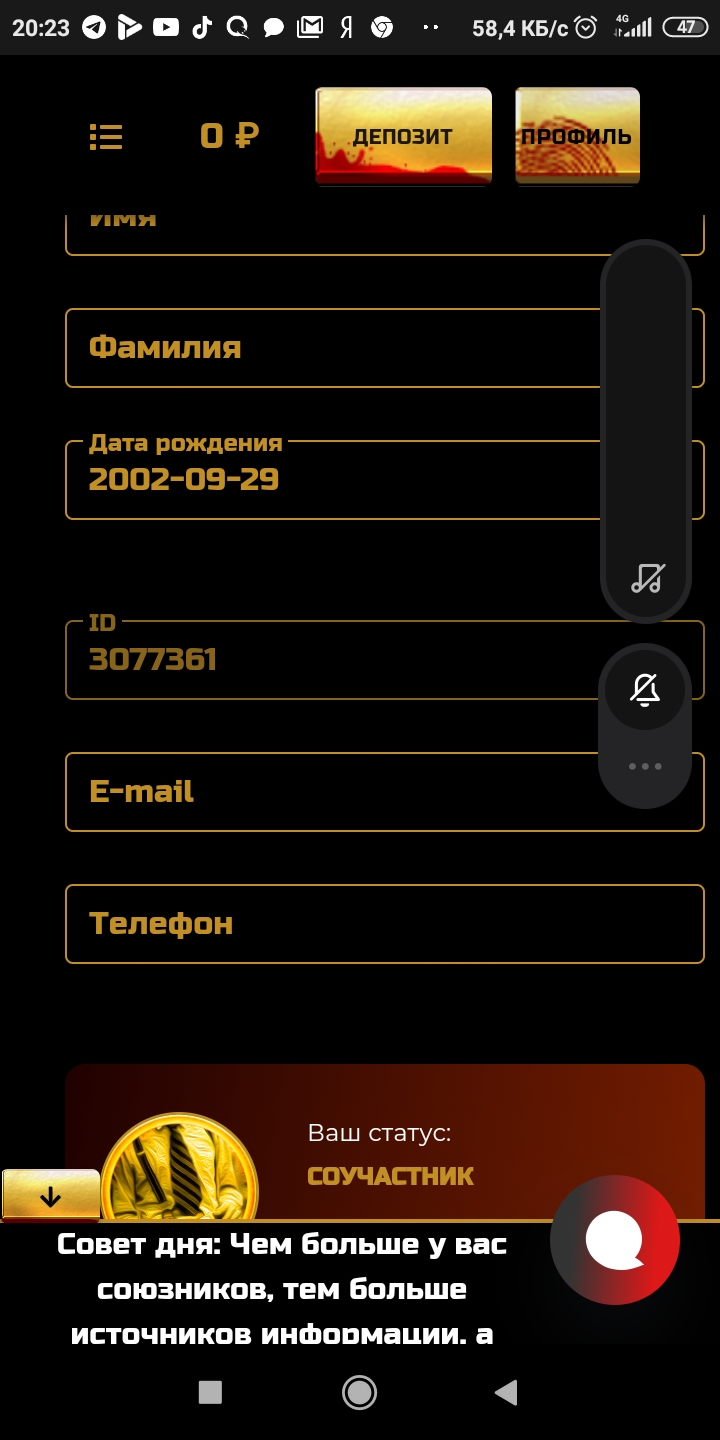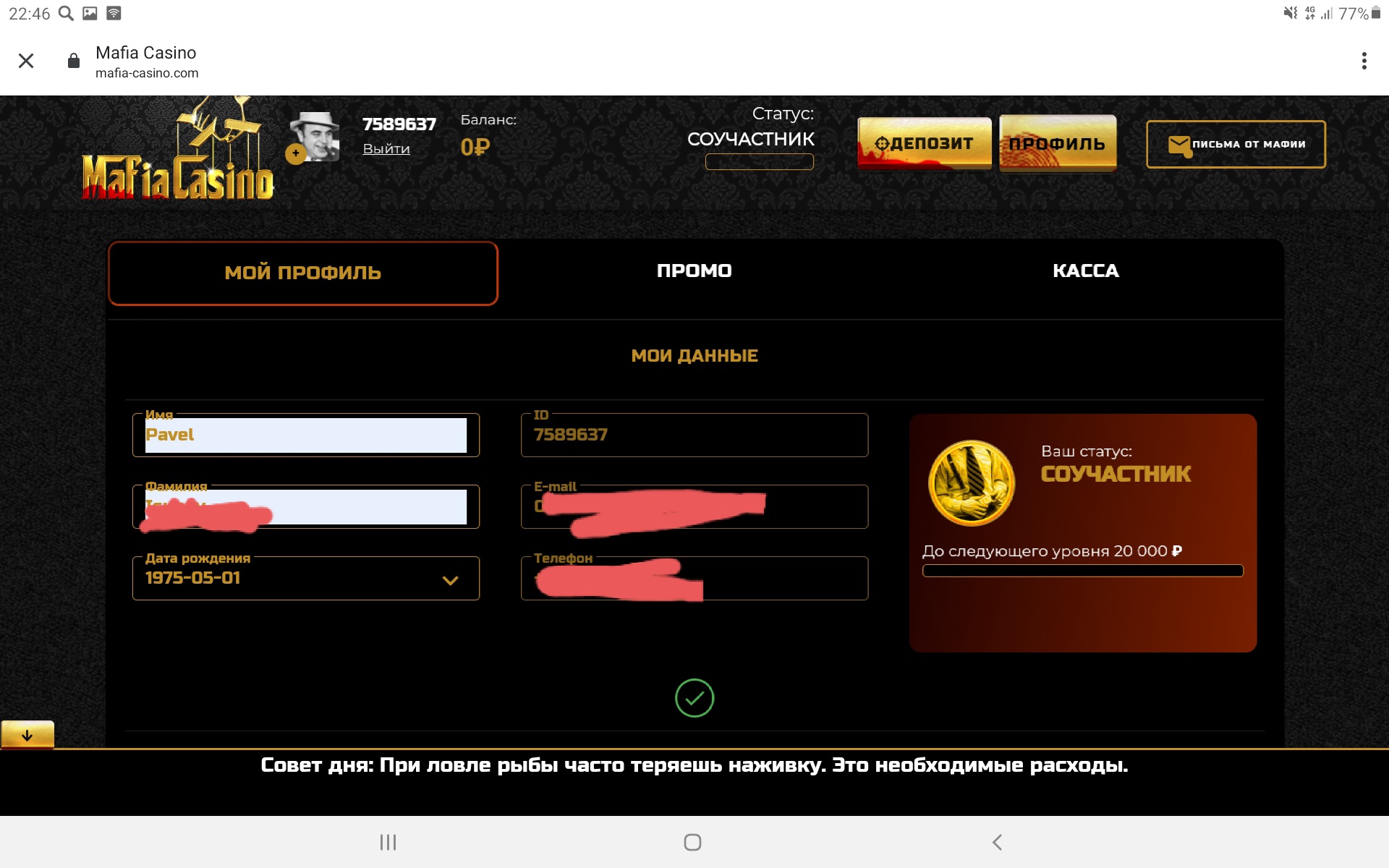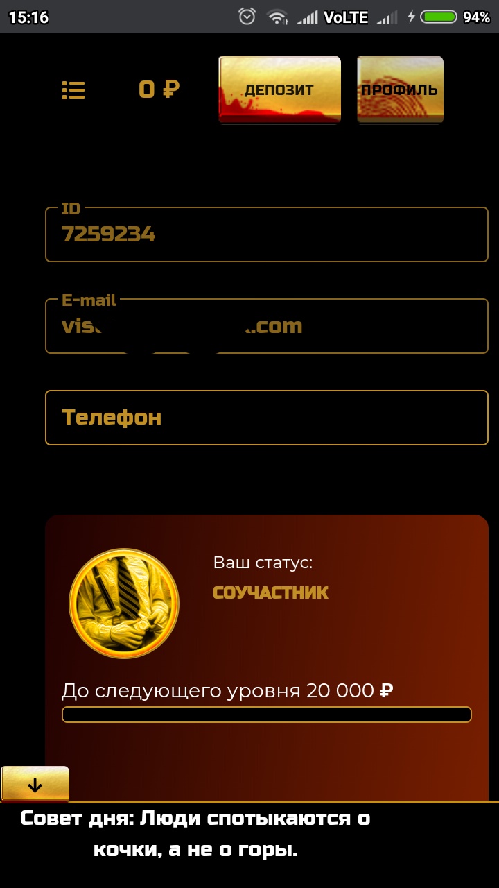 Скриншот вашего профиля в данном казино(значимую информацию можно убрать)!