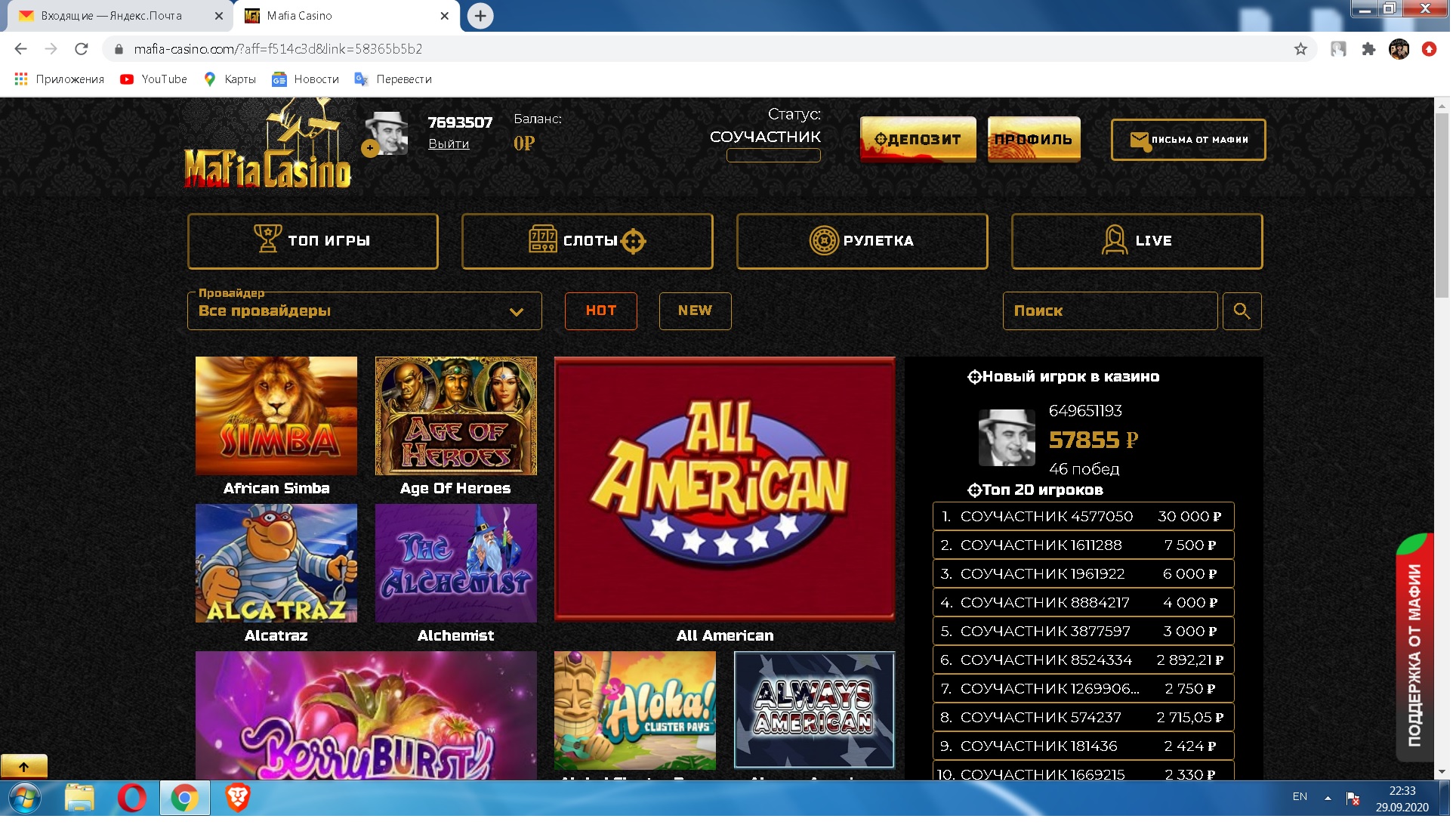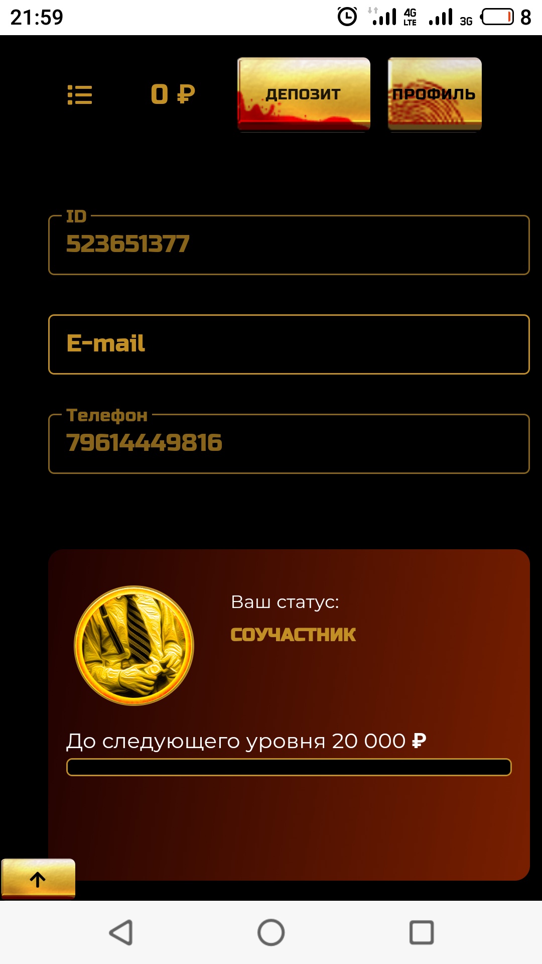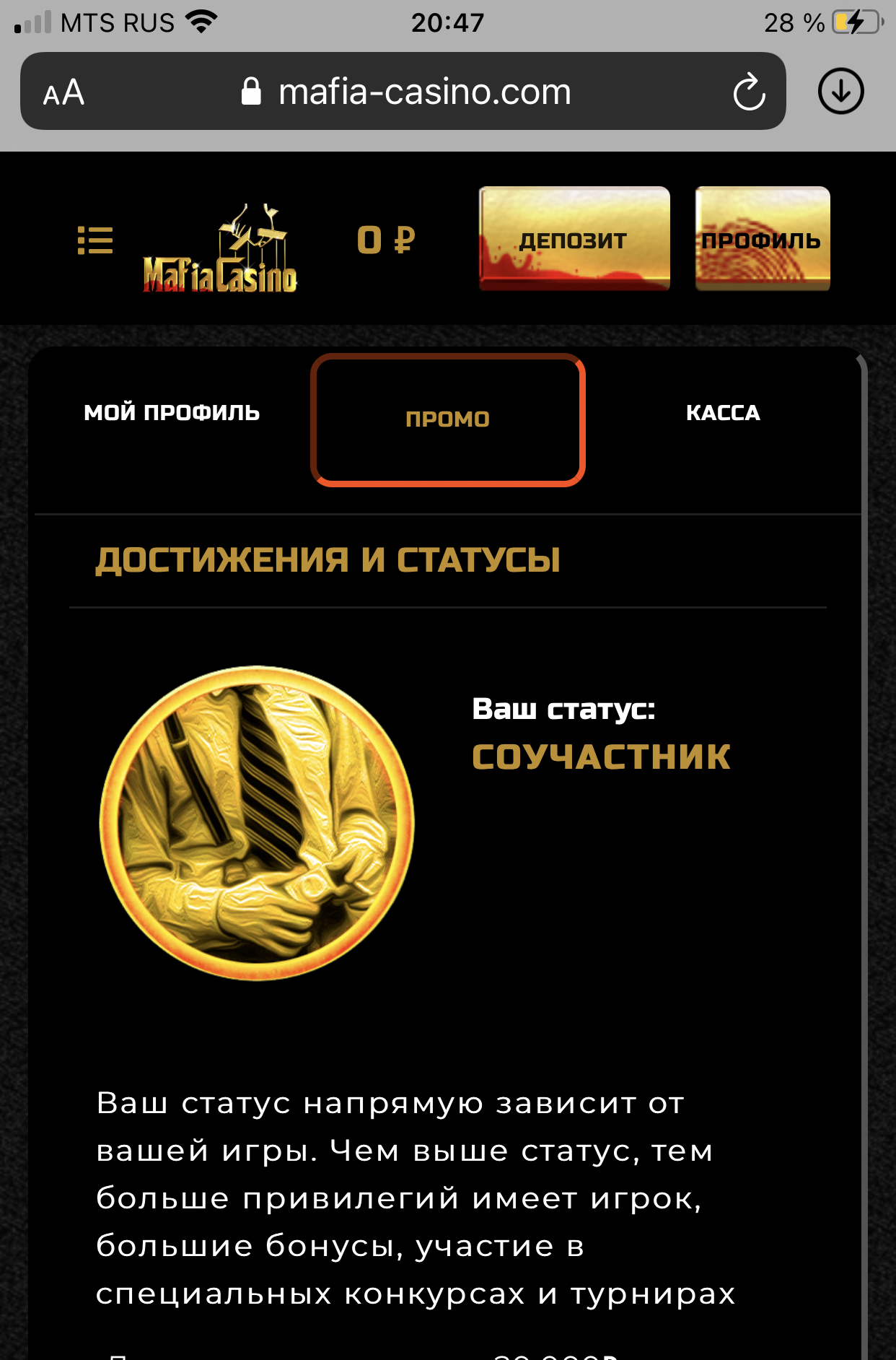 Скриншот вашего профиля в данном казино(значимую информацию можно убрать)!