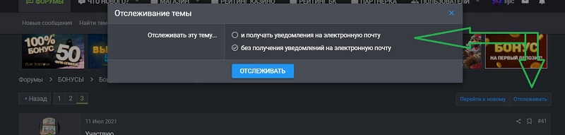 а если тему отслеживать, то сверху выбор с уведомлениями или без на емайл. если всё равно не приходит, беда какая-то