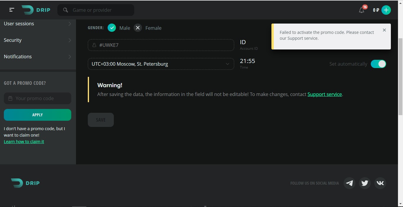 не могу активировать мой промокод, пишет failed и в саппорте пишут что такого нет в системе..